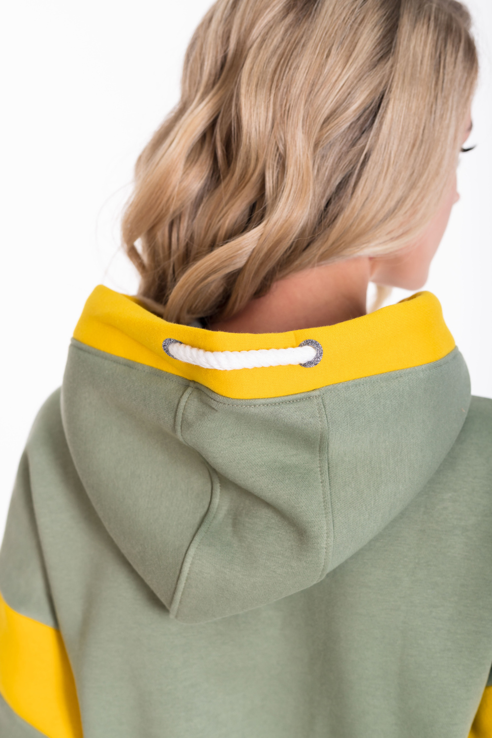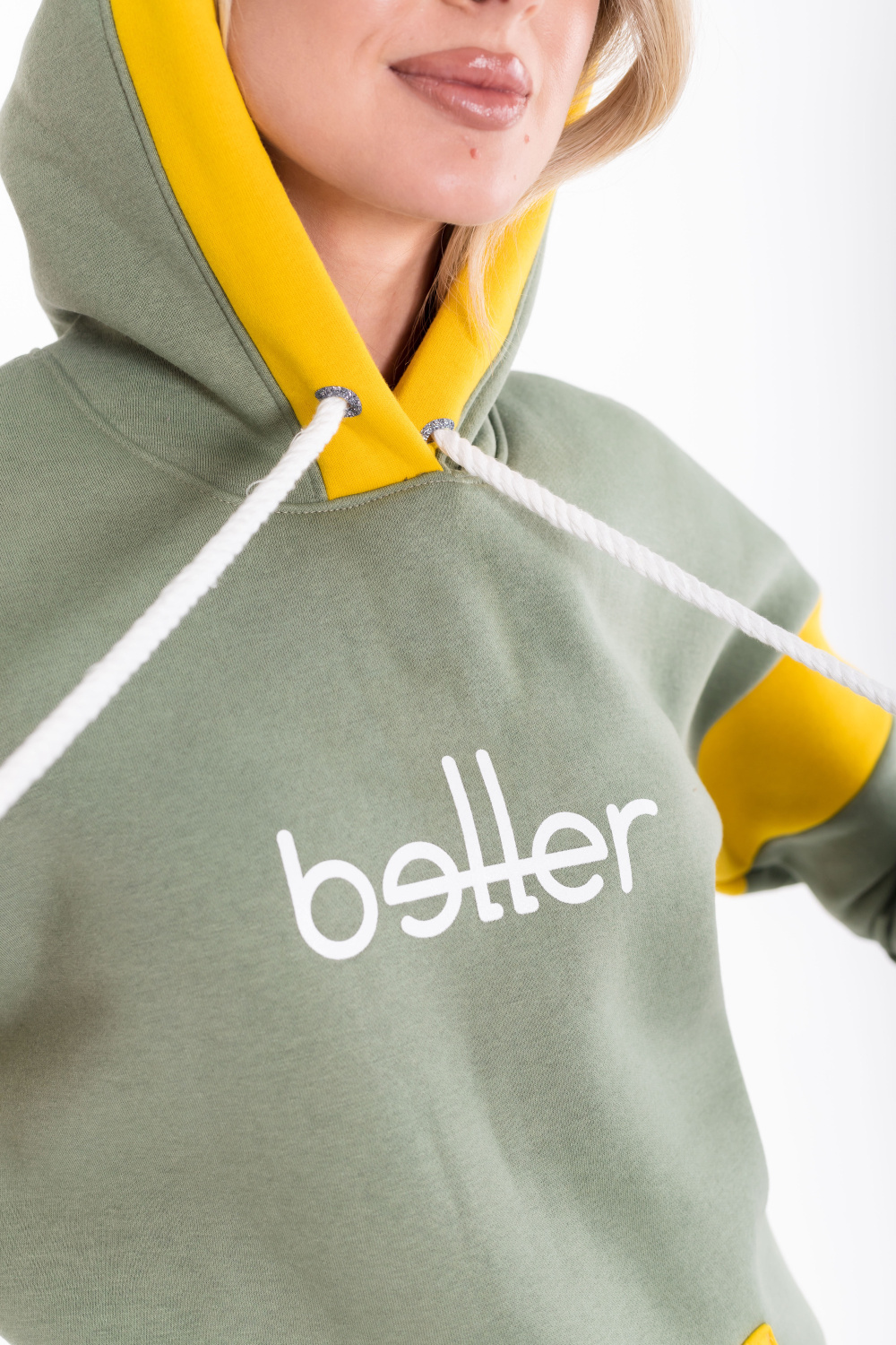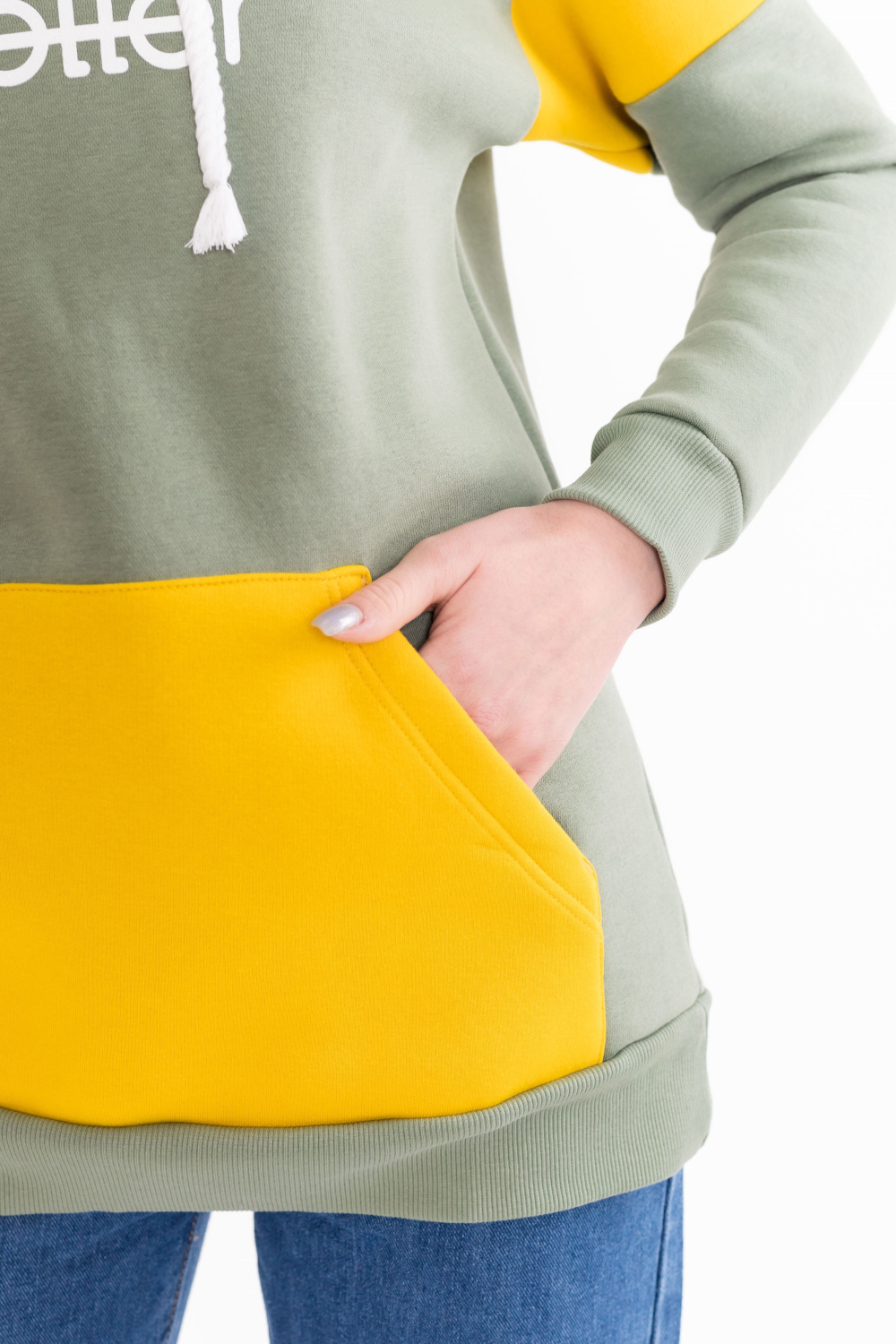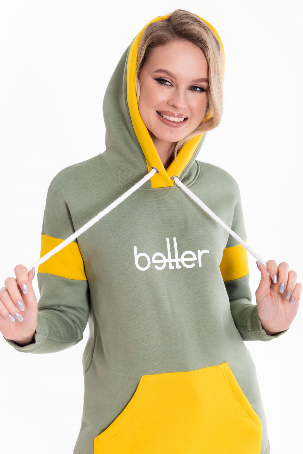 Толстовка выполнена из полотна с начёсом. Толстовка с длинным рукавом, притачными манжетами и поясом. Спереди расположен накладной карман-кенгуру и нанесён принт. Капюшон с планкой с люверсами, через которые проложен шнур.