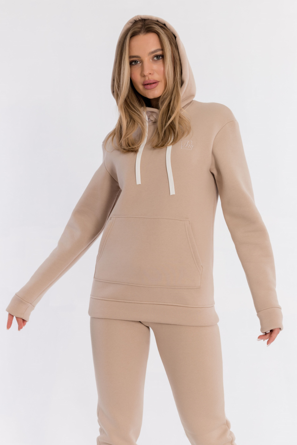 Толстовка выполнена из полотна c начёсом (футер трёхнитка). Капюшон со шнуром. Спереди расположена вышивка и карман-кенгуру.