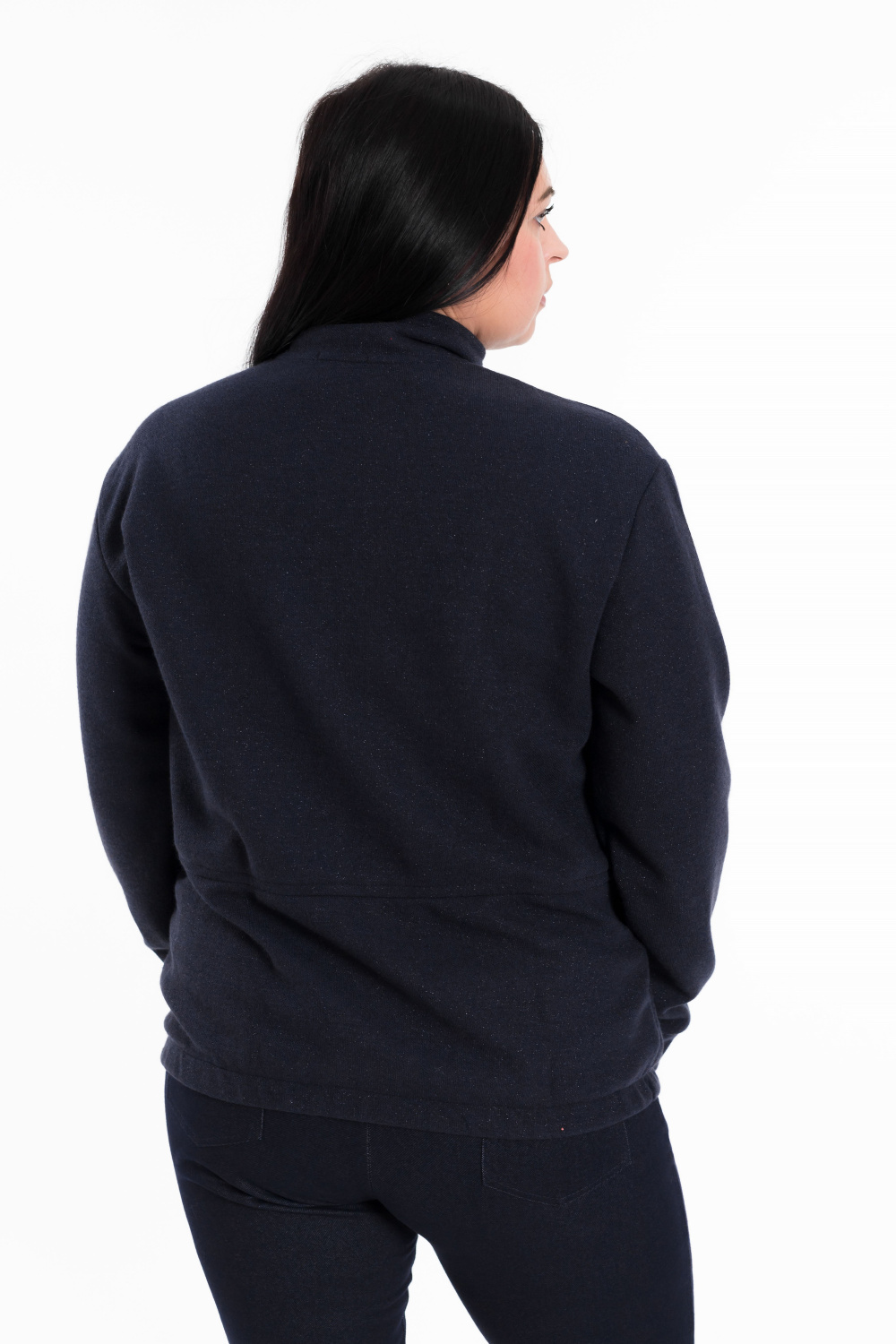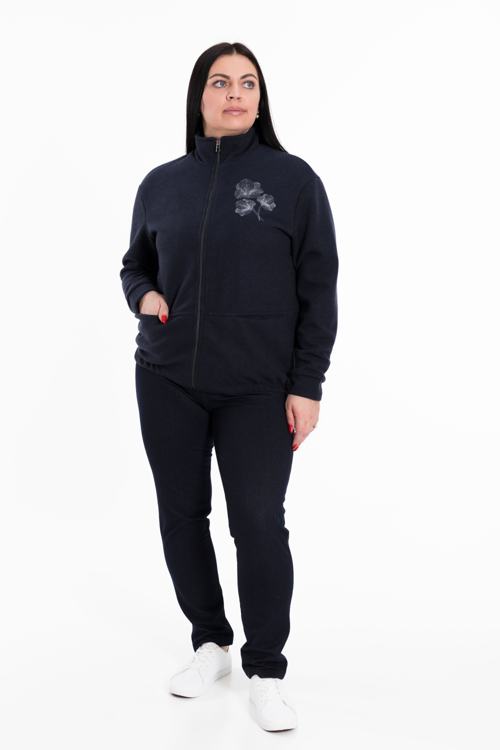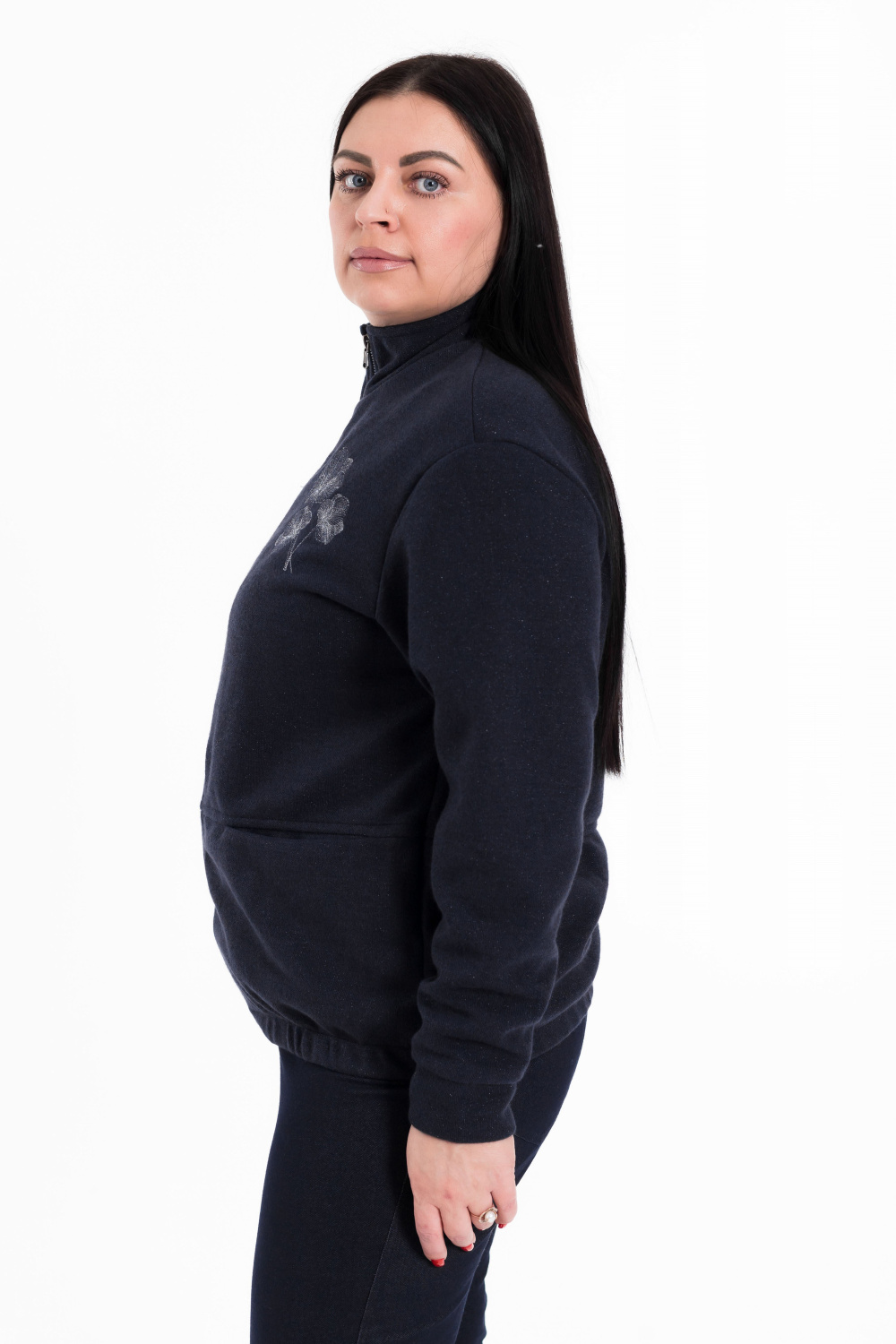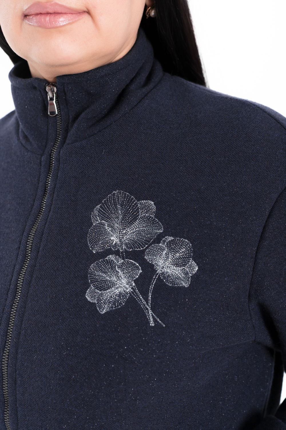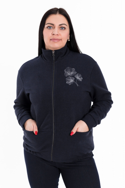 Толстовка выполнена из полотна академик в синем цвете с мерцающим блеском. Спереди с карманами и застёжкой на молнию. Воротник-стойка, рукава на манжетах.  С левой стороны расположена вышивка.