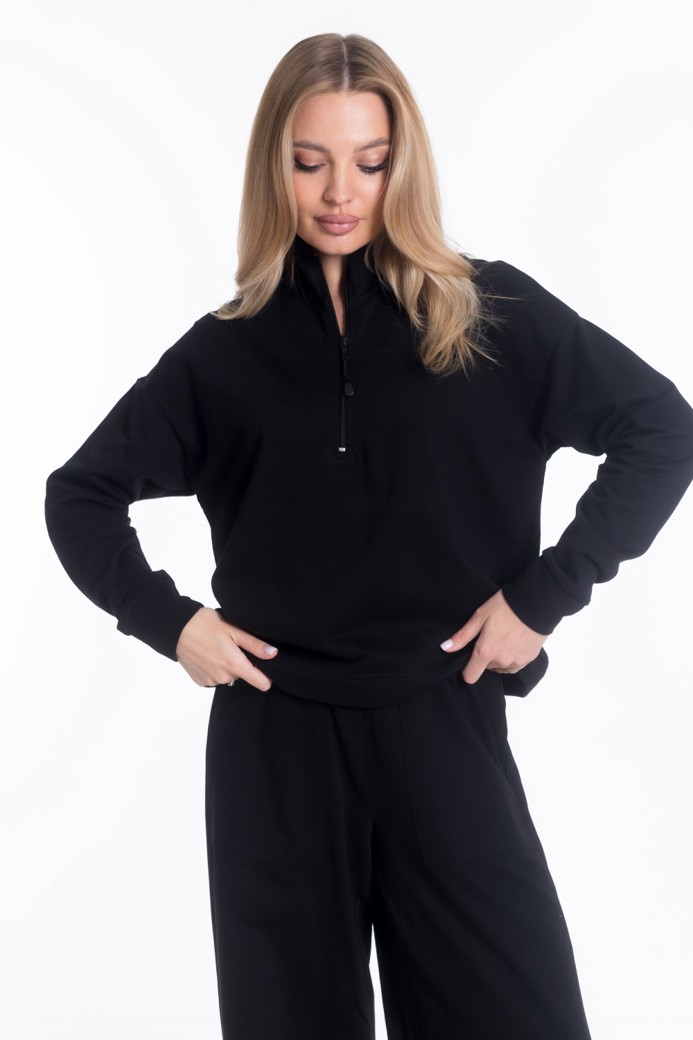 Женская толстовка из облегченного футера 2х нитки — отличный выбор для повседневной носки. Модель со спущенной проймой и притачной манжетой на рукаве обеспечивает свободу движений. Воротник-стойка и застёжка на молнию на горловине добавляют изделию элегантность. Однотонная черная толстовка идеально подойдёт для активного отдыха или прогулок.