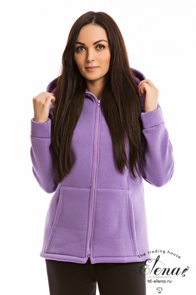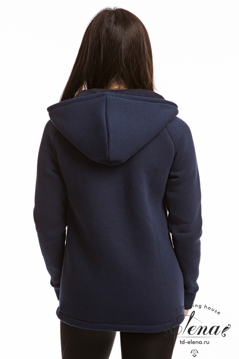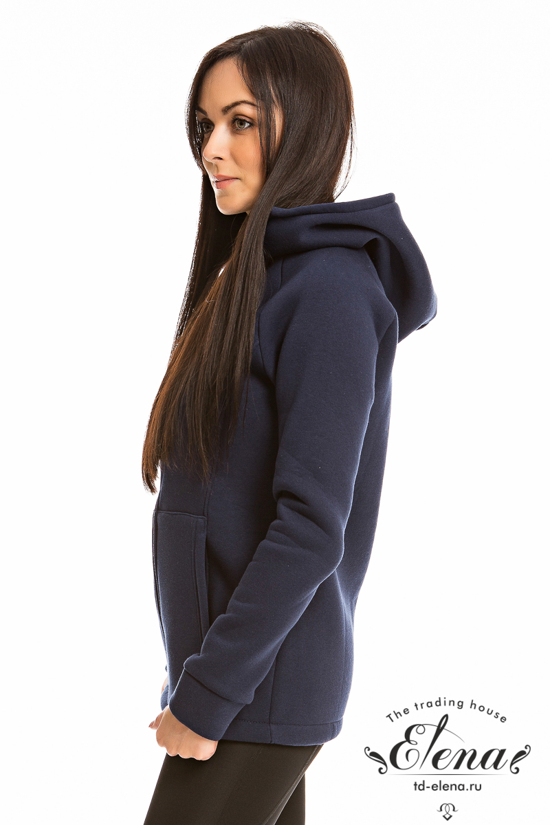 Женская толстовка, с центральной застёжкой на молнию, выполнена из полотна с начёсом. В модели предусмотрен капюшон. Длинные рукава покроя реглан на манжетах внизу, по бокам расположены карманы.