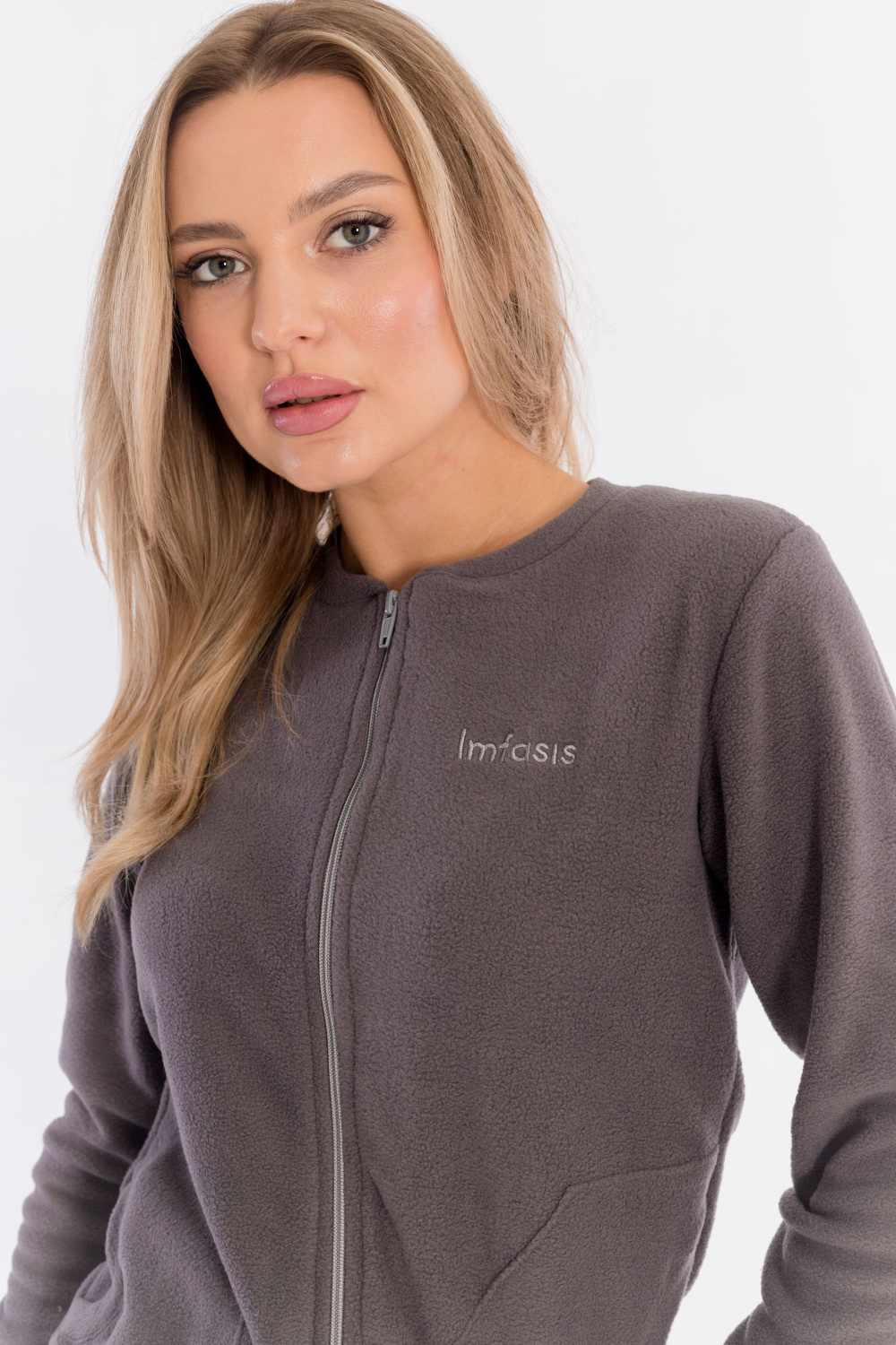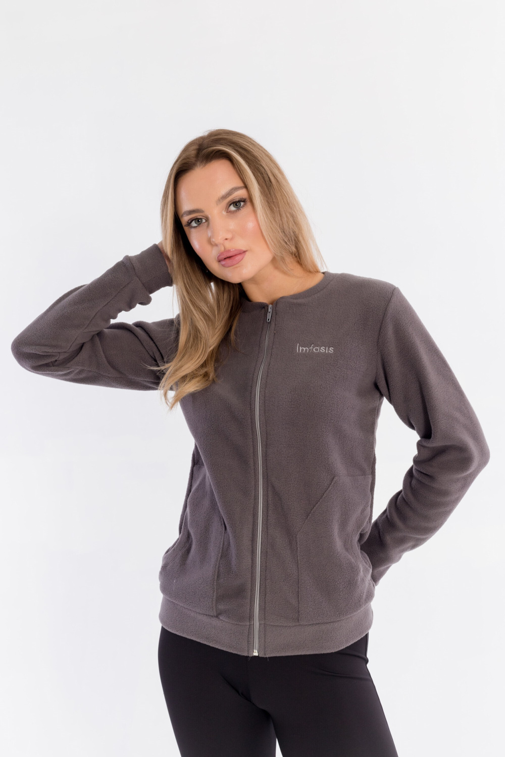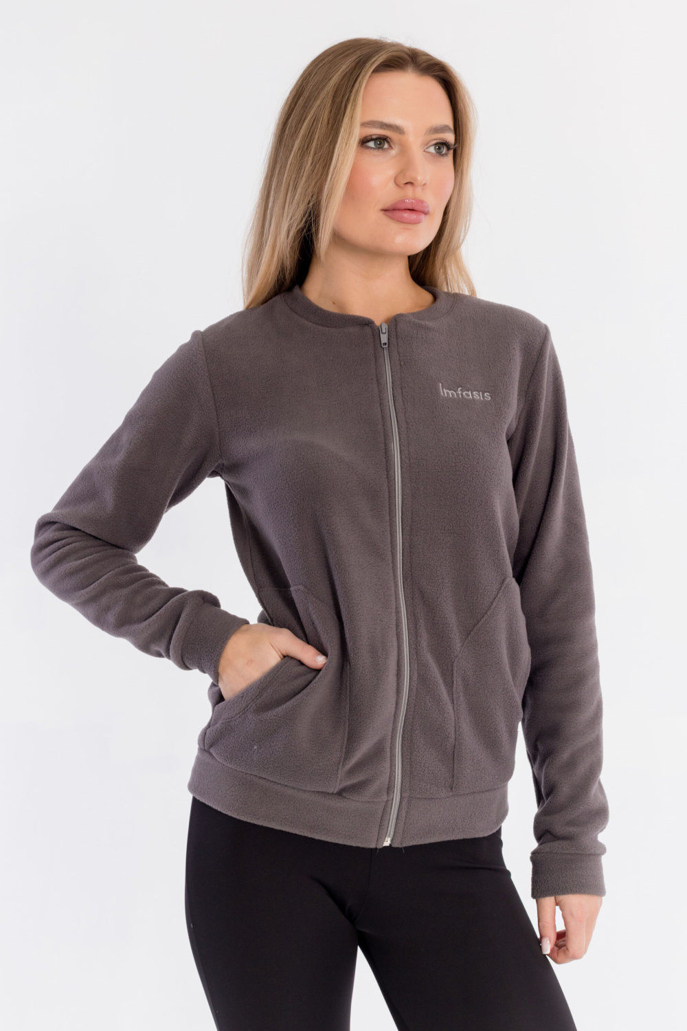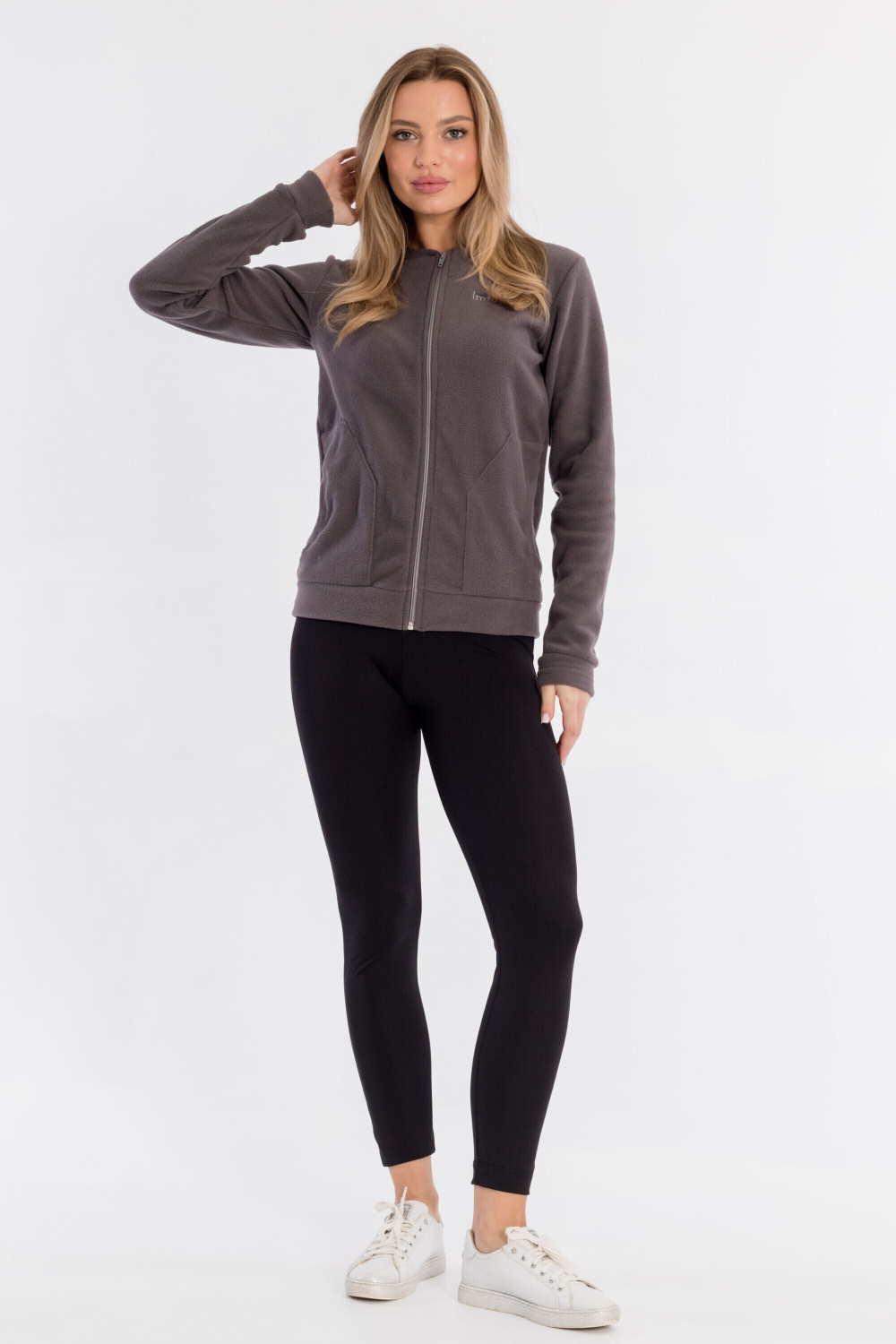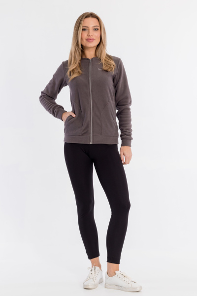 Женская толстовка на молнии выполнена из флиса. Длинный рукав, спереди расположены накладные карманы.