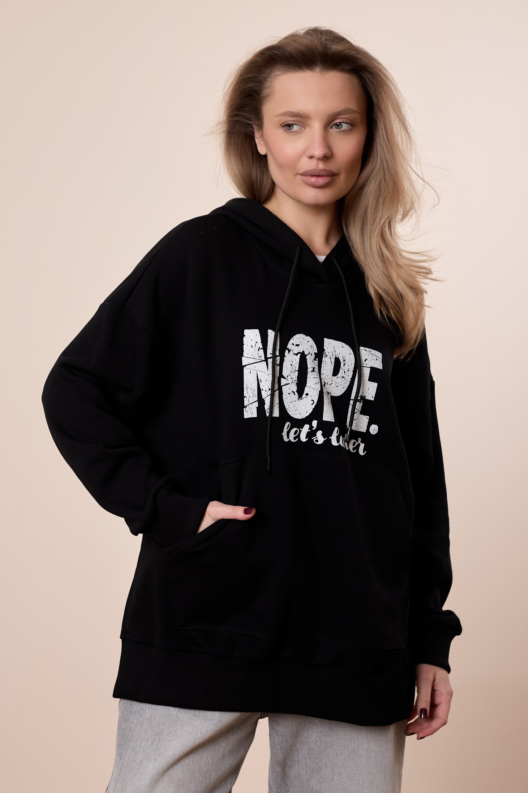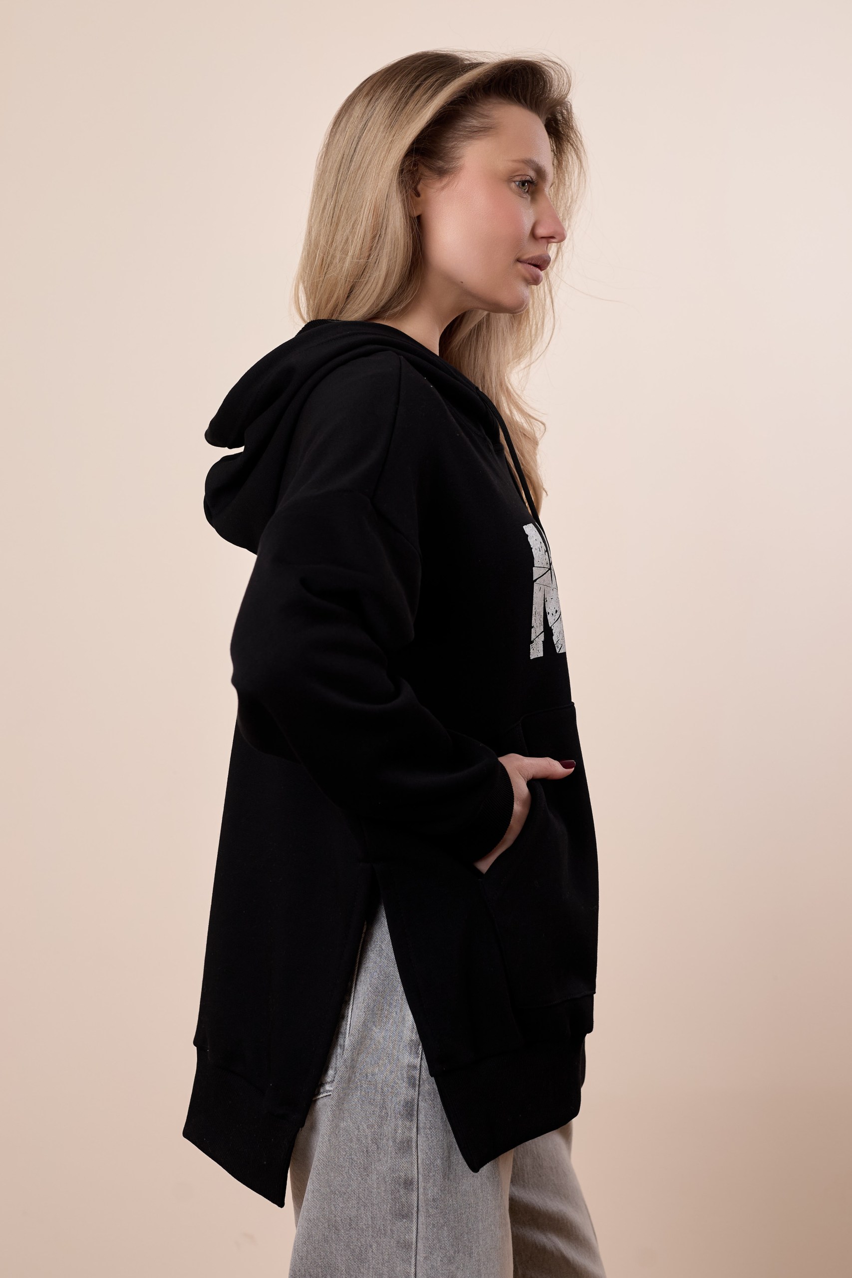 С капюшоном, со спущенным рукавом, к карманом-кенгуру на полочке. Полочка короче спинки, в боковых швах разрезы. Манжеты и пояс из кашкорсе в цвет основного полотна. На полочке принт.