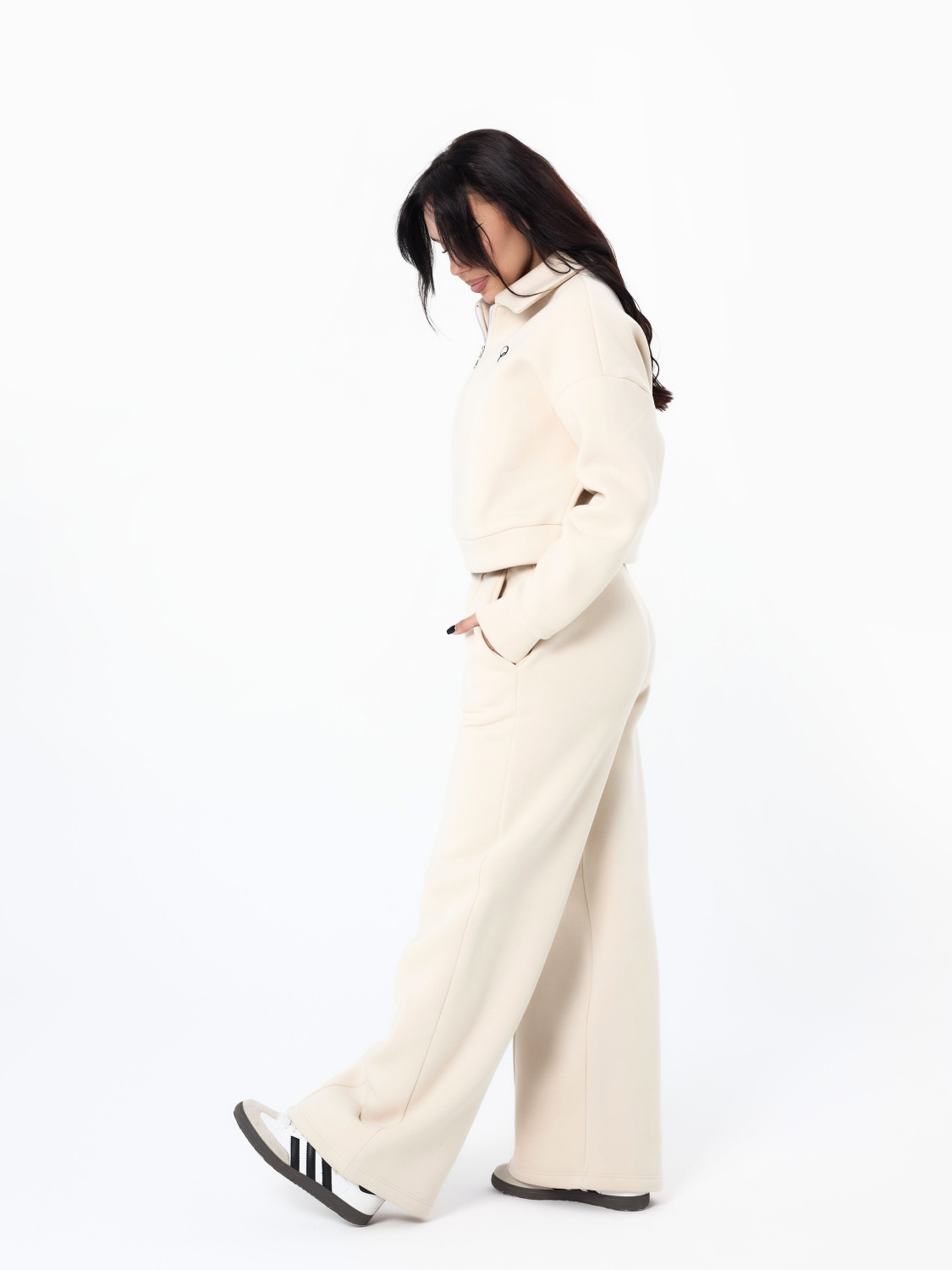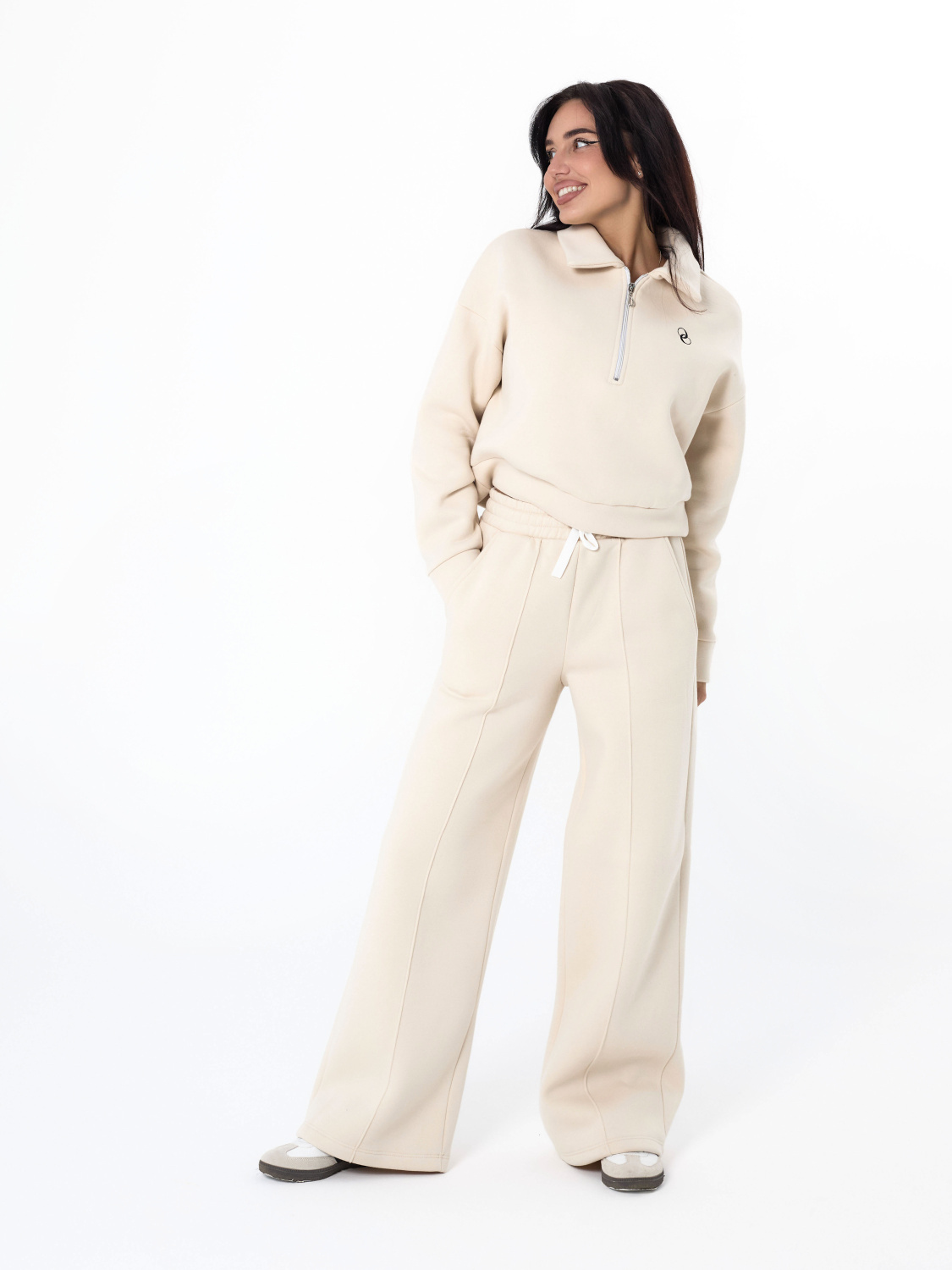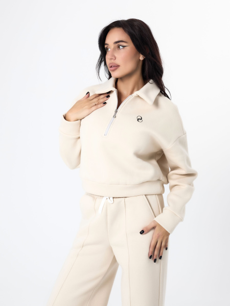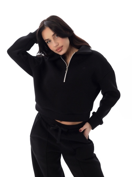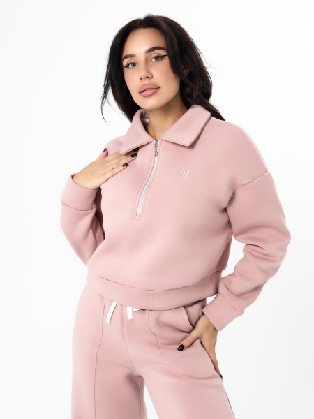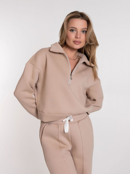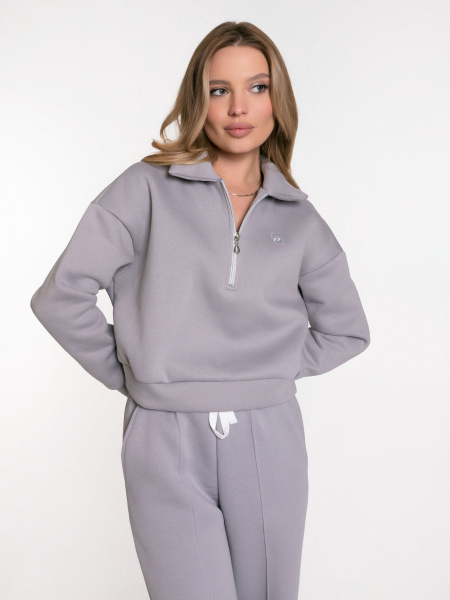 Женская толстовка с застежкой на короткую молнию и спущенной линией плеча. Модель выполнена из футера с начесом. Лаконичный дизайн дополнен стильной вышивкой с левой стороны. Манжеты рукавов и низ изделия оформлены планкой из основного полотна для аккуратного силуэта. Удобная и современная модель для повседневной носки.