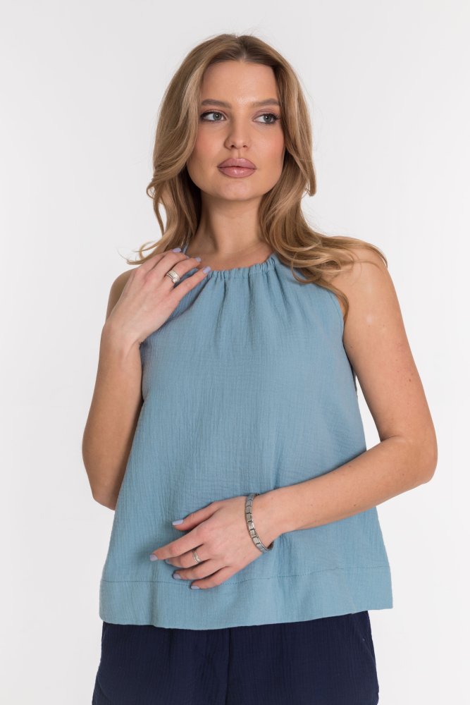 Топ создан для плотного облегания силуэта, он придает фигуре стройность и подчеркивает ее линии. Благодаря бейке по горловине и проймам, топ выглядит более аккуратным и завершенным. Такой дизайн добавляет изделию дополнительную деталь и делает его стильным.