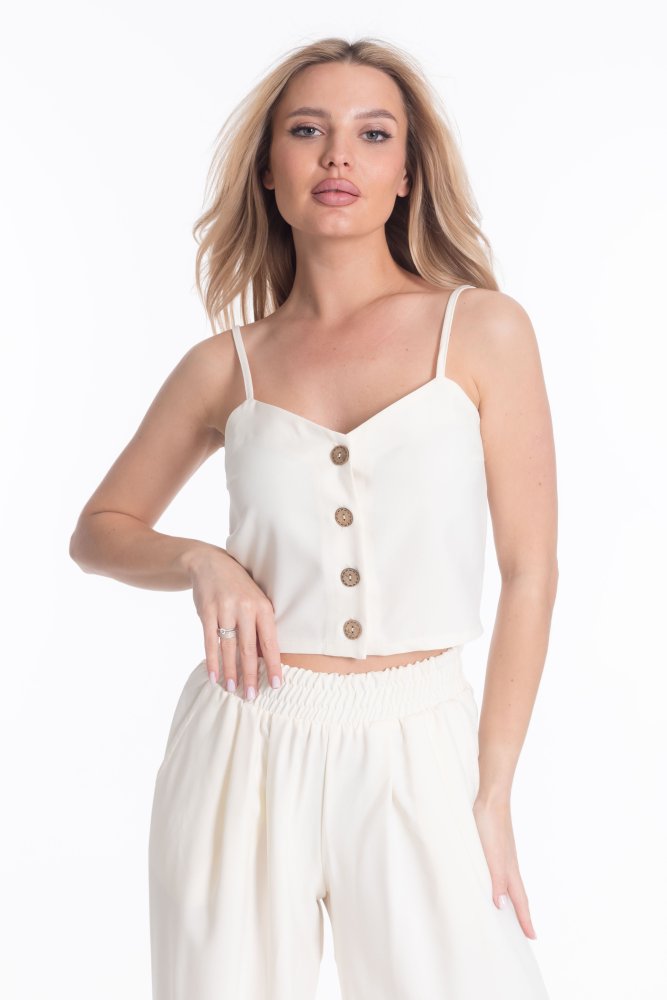 Топ из однотонной кулирки с лайкрой. С коротким рукавом. Длина выше талии.