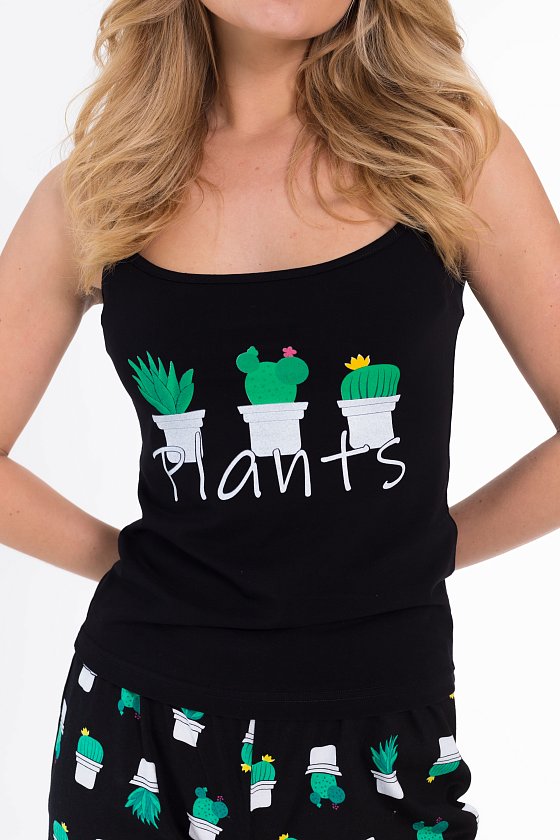Топ из однотонной кулирки с лайкрой, на бретелях, на полочке принт, обработан бейкой из основного полотна.