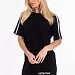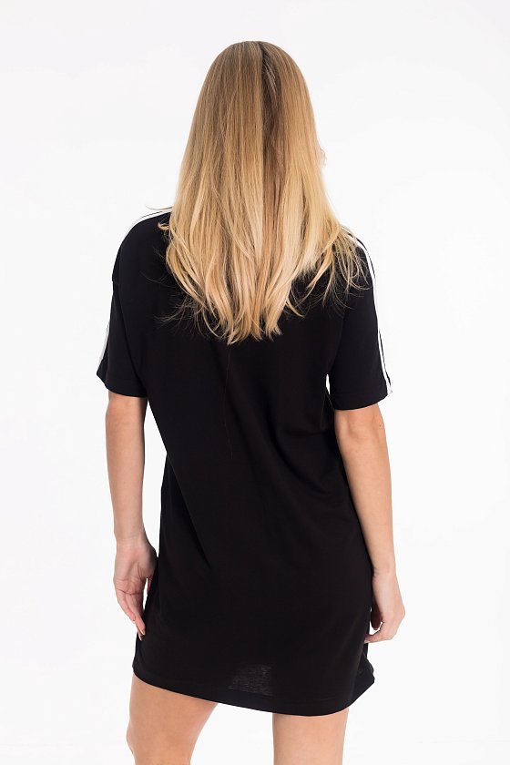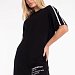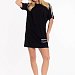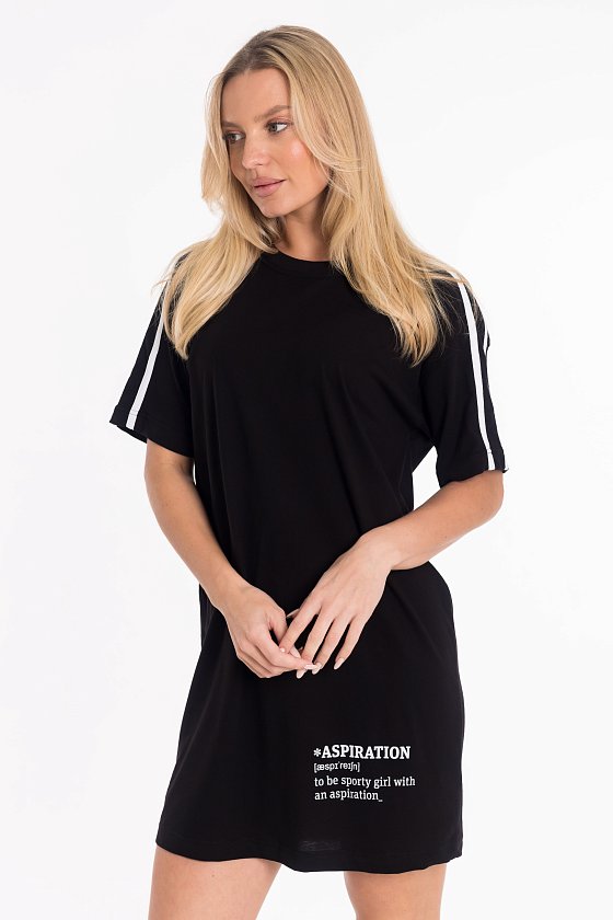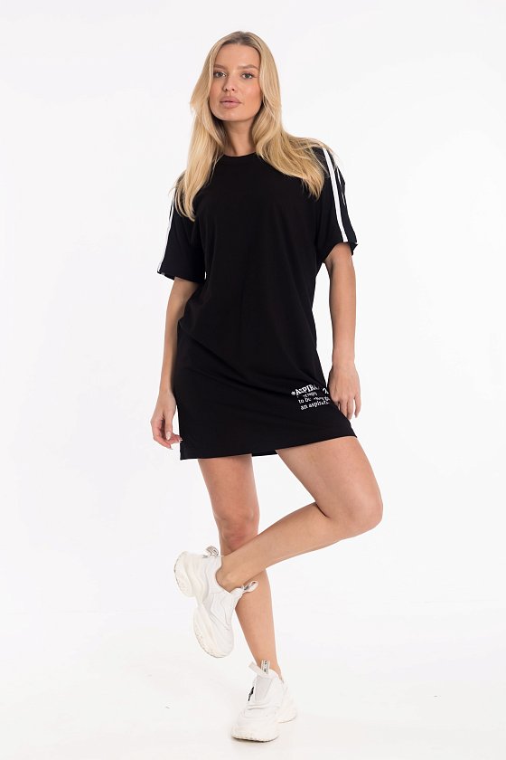 Туника женская из хлопкового полотна. Модель выполнена в лаконичном дизайне с короткими рукавами и классическим круглым вырезом горловины. Особенность модели — контрастные лампасы на рукавах, добавляющие спортивный акцент. Низ переда украшен принтом, создающим динамичный образ. Практичный вариант для прогулок, отдыха и спортивного стиля.