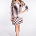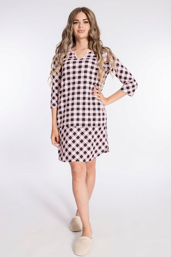 Женская туника выполнена из кулирки в клетку. Рукава длиной 3/4, вырез горловины фигурный. По бокам размещены карманы.