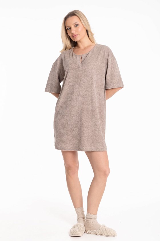 Женская туника из однотонной махры — отличный выбор для создания комфортного образа. Туника имеет прямой силуэт, который подходит для разных типов фигур, и спущенную линию плеча, что придаёт модели изысканность. Рукав туники доходит до локтя, что обеспечивает удобство и свободу движений. Вырез дополнен разрезом и оформлен планкой, что добавляет изделию изюминку. Такая туника идеально подойдёт для повседневной носки. Изготовленная из натуральной ткани, туника обеспечит комфорт в течение всего дня.