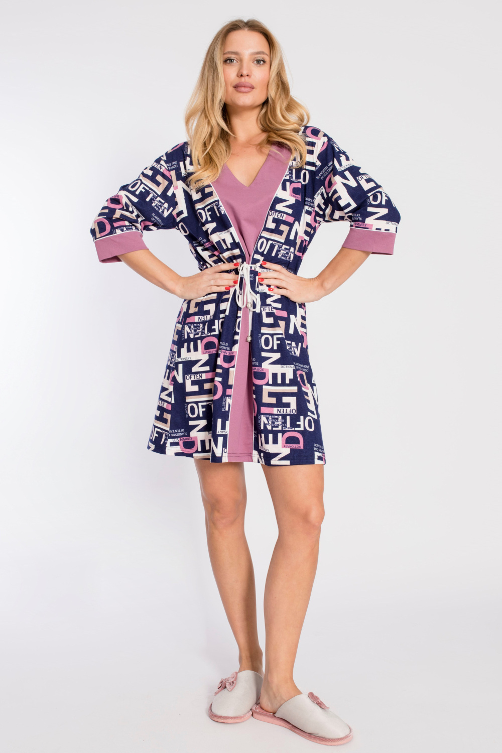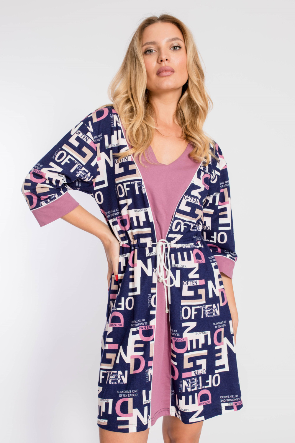 Туника выполнена из кулирки с набивным рисунком, спереди и на манжетах рукавов однотонные вставки с отделочным кантом. По талии кулиска со шнуром, рукава длиной 3/4.