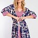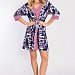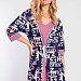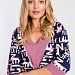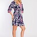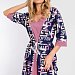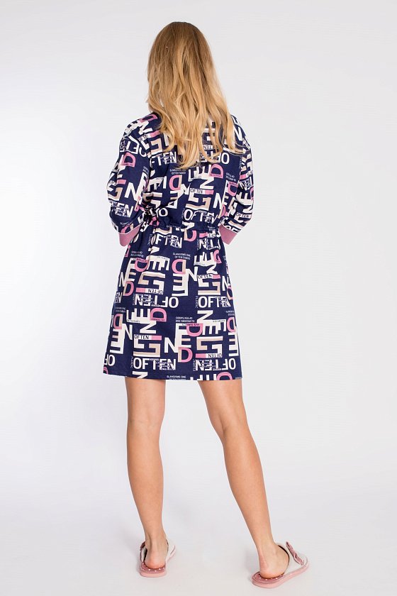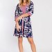 Туника выполнена из кулирки с набивным рисунком, спереди и на манжетах рукавов однотонные вставки с отделочным кантом. По талии кулиска со шнуром, рукава длиной 3/4.