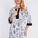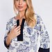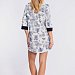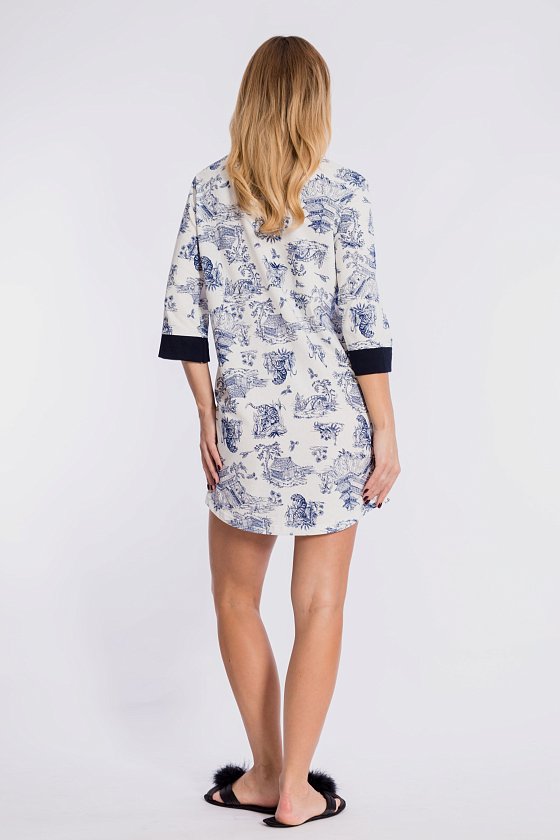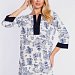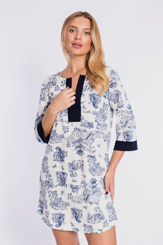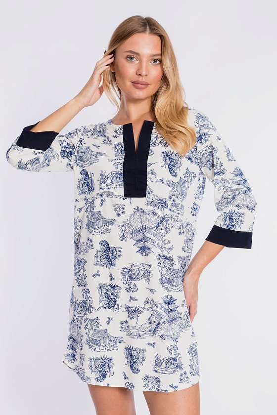 Туника выполнена из кулирки с набивным рисунком, с однотонными отделочными планками горловины и манжетами на рукавах. Рукава длиной 3/4, низ туники закруглённый спереди и сзади.