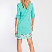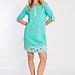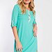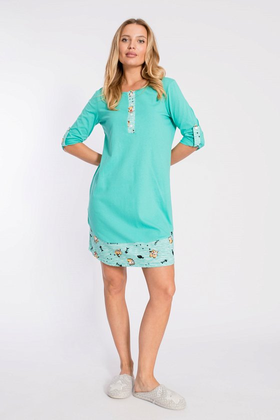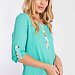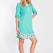 Туника выполнена из однотонной кулирки со вставками из отделочного полотна. Туника с втачным рукавом длиной 3/4 с патами. Спереди планка с пуговицами. По низу переда и спинки фигурные отделочные полосы.