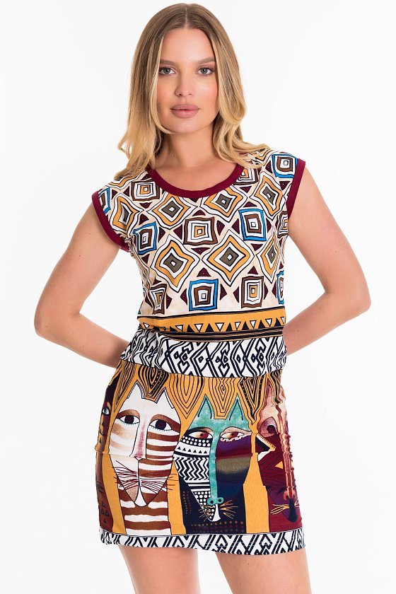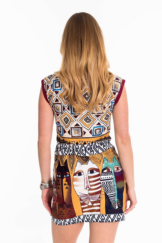 Туника домашняя выполнена из набивного хлопкового полотна. Покрой прямой, без рукавов, горловина имеет круглый вырез. Проймы и горловина обработаны бейкой.