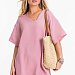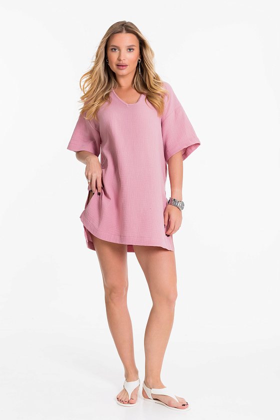 Туника из однотонного муслина. Свободного кроя, со спущенным коротким рукавом, V-образной горловиной. Туника длиной до середины бедра. В боковых швах разрезы.