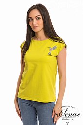 Туника женская выполнена их кулирного полотна. Вырез горловины круглый, рукав короткий, покроя реглан. Планки на рукавах, горловине и низу изделия из отделочного полотна контрастного цвета. Спереди расположен оригинальный принт.
