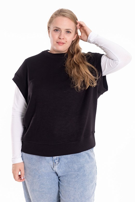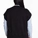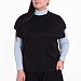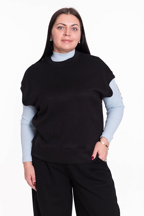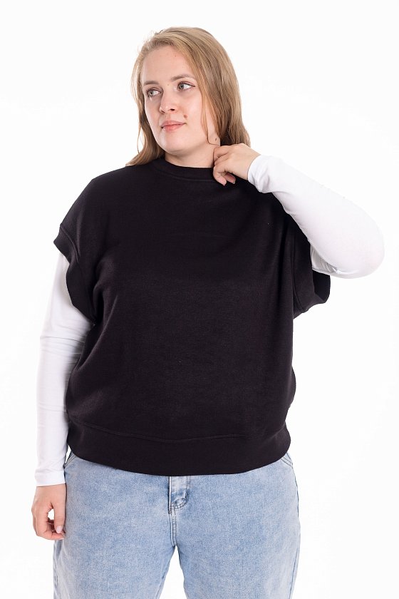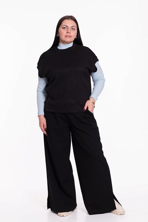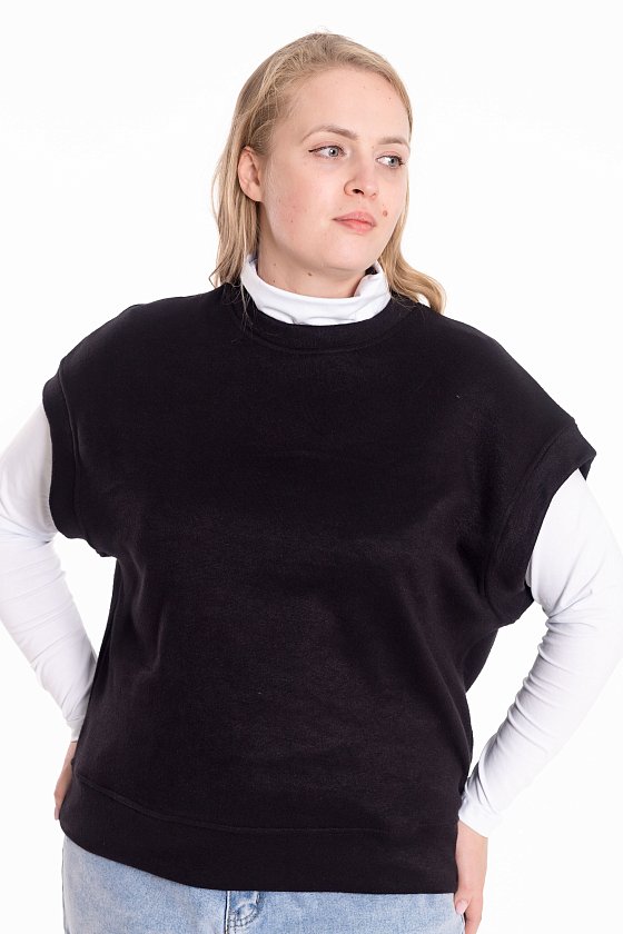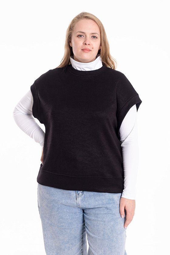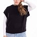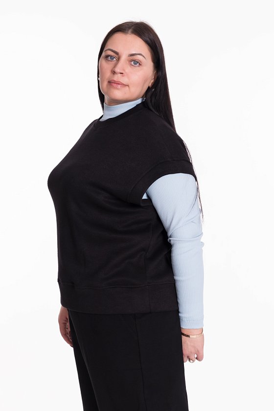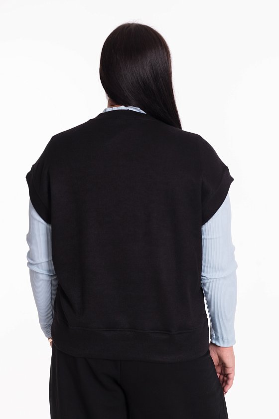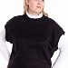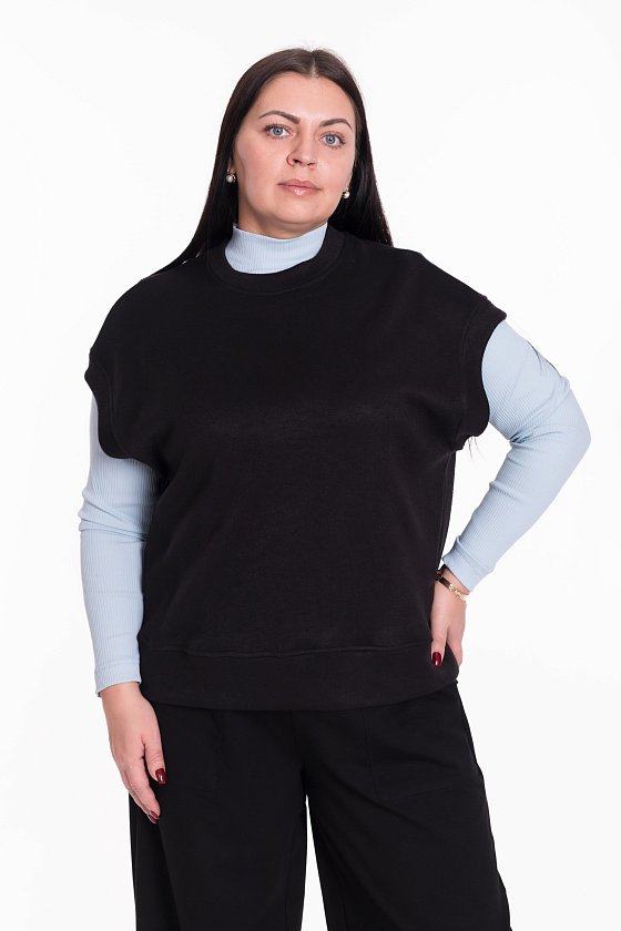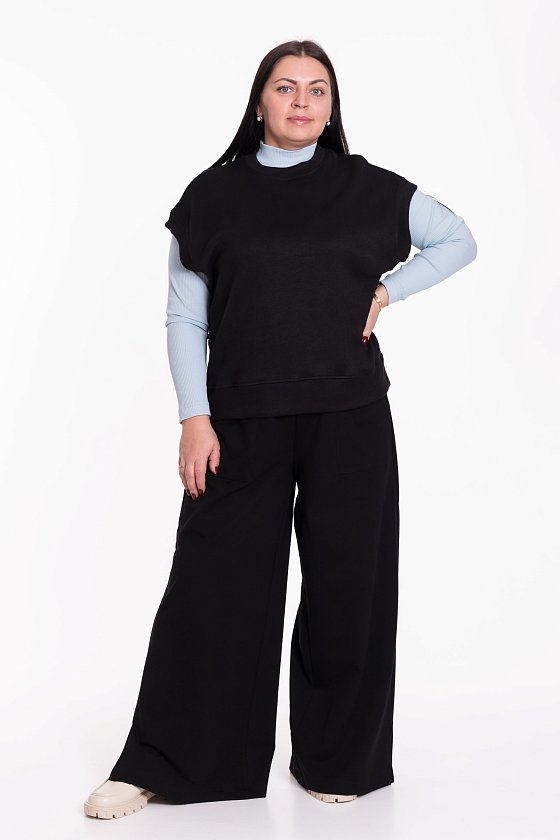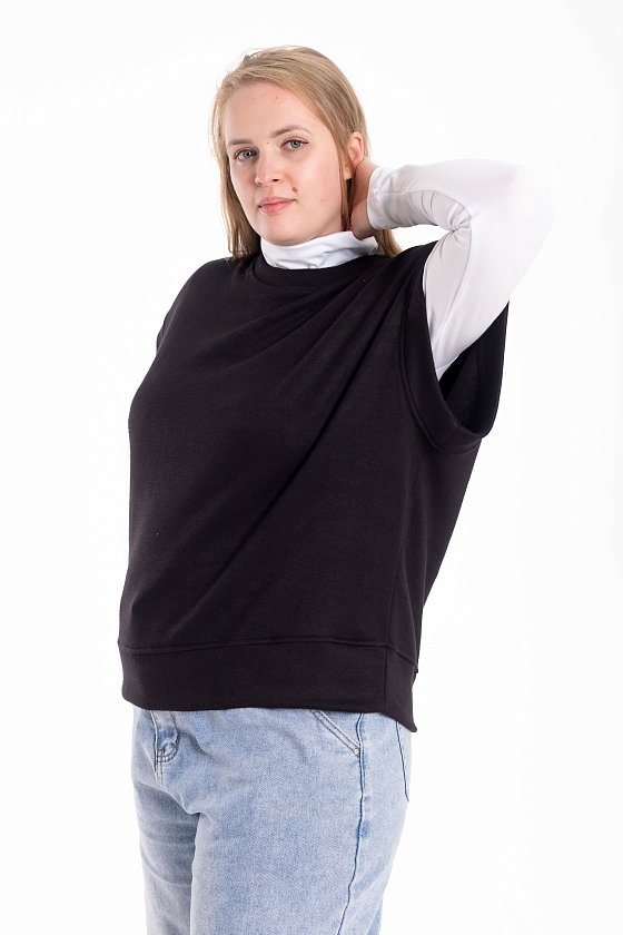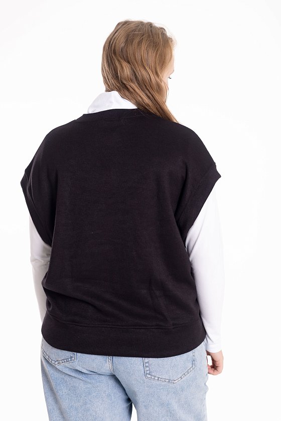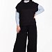 Жилет выполнен из однотонного вязаного полотна "ангора". Со спущенной линией плеча, притачными планками по горловине, проймам и поясу.