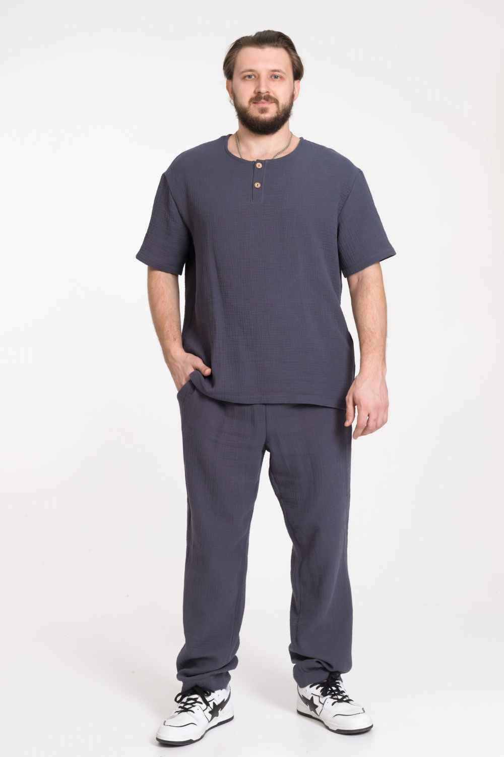 Мужские брюки из хлопкового полотна - муслина. Брюки свободного прямого кроя с притачным поясом на резинке и шнуре. По бокам размещены карманы.