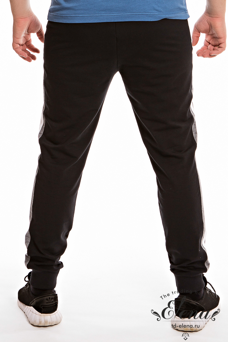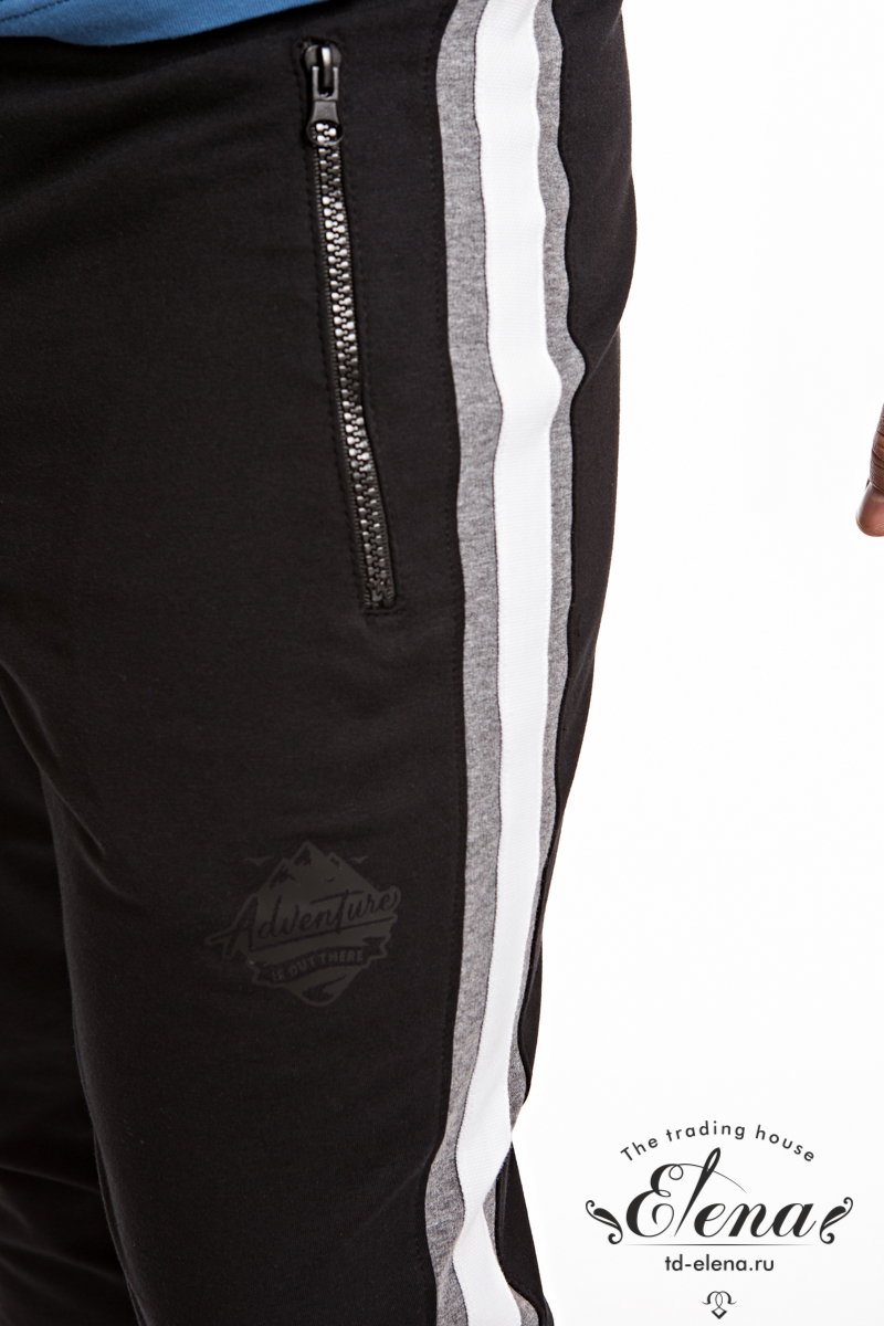 Мужские брюки выполнены из футер петли с лайкрой, по бокам размещены карманы на молнии и вставки из отделочного полотна. Пояс брюк на резинке и шнуре, низ на манжетах.