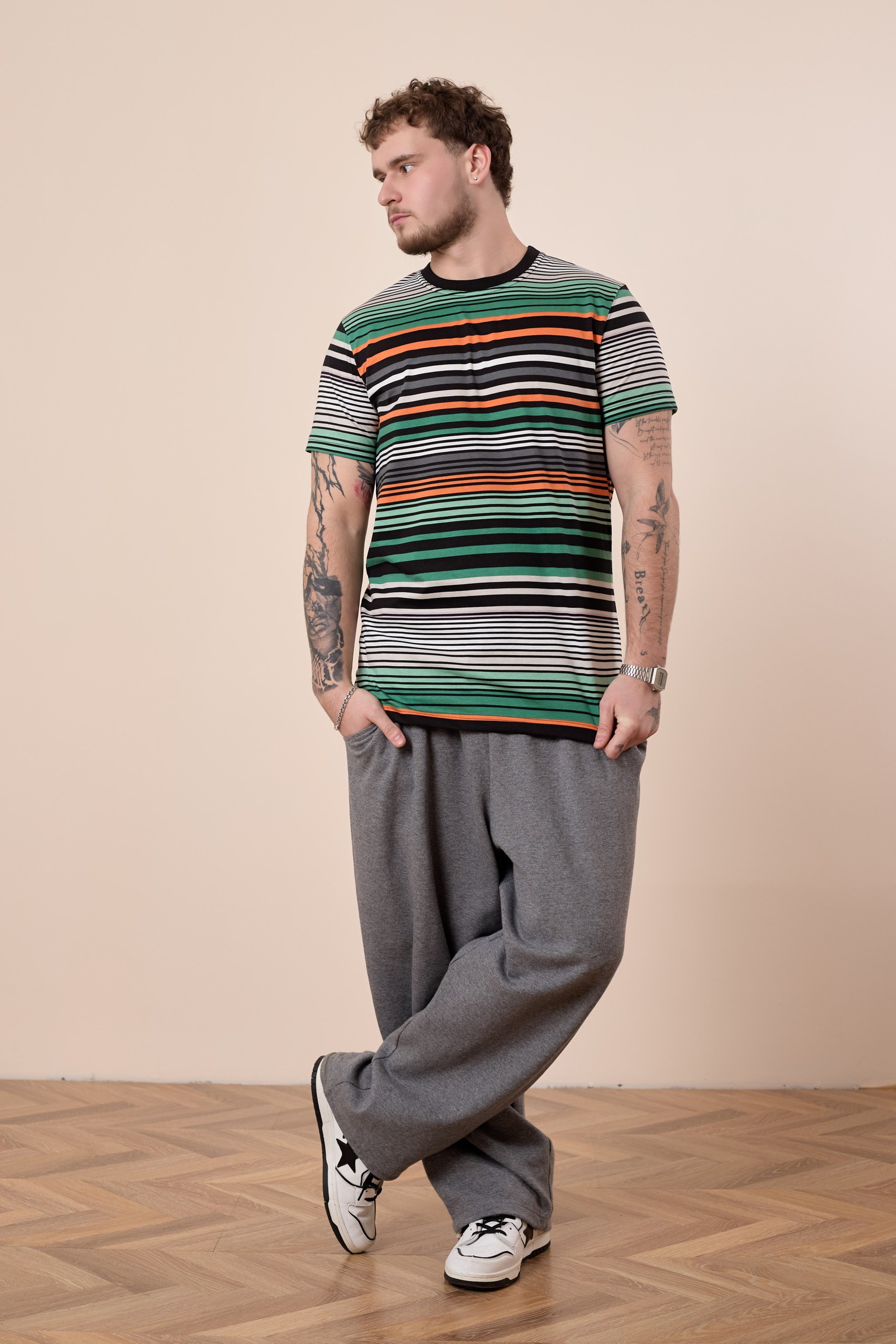 Мужская футболка выполнена из хлопкового полотна с набивным рисунком. Покрой свободный, горловина с круглым вырезом.