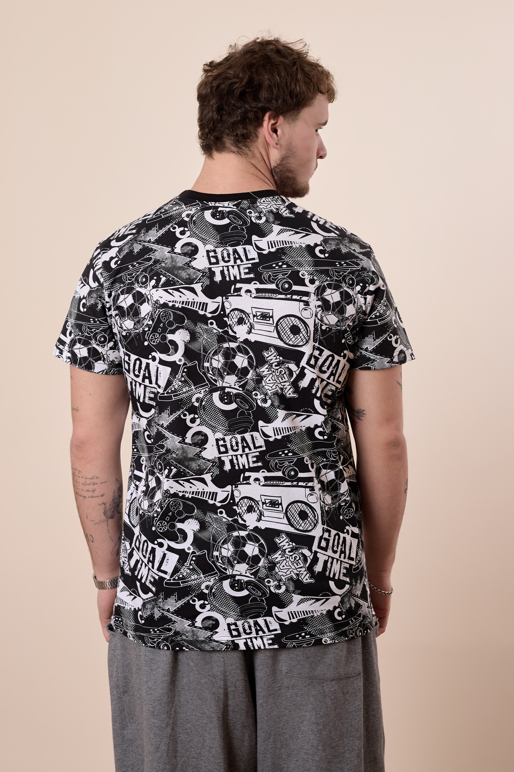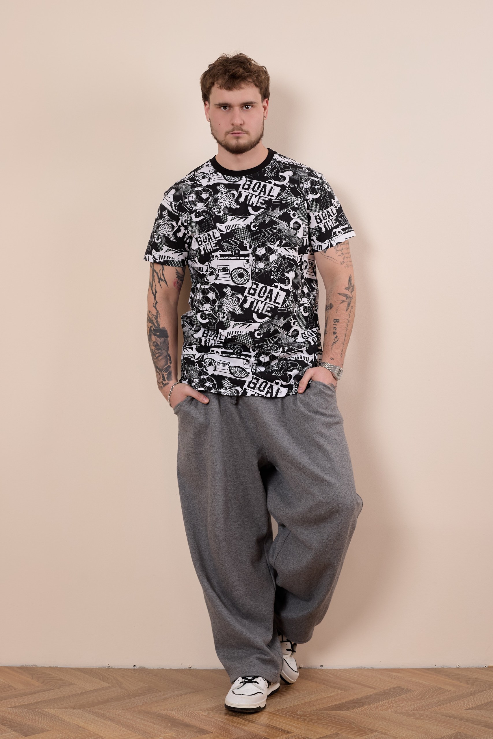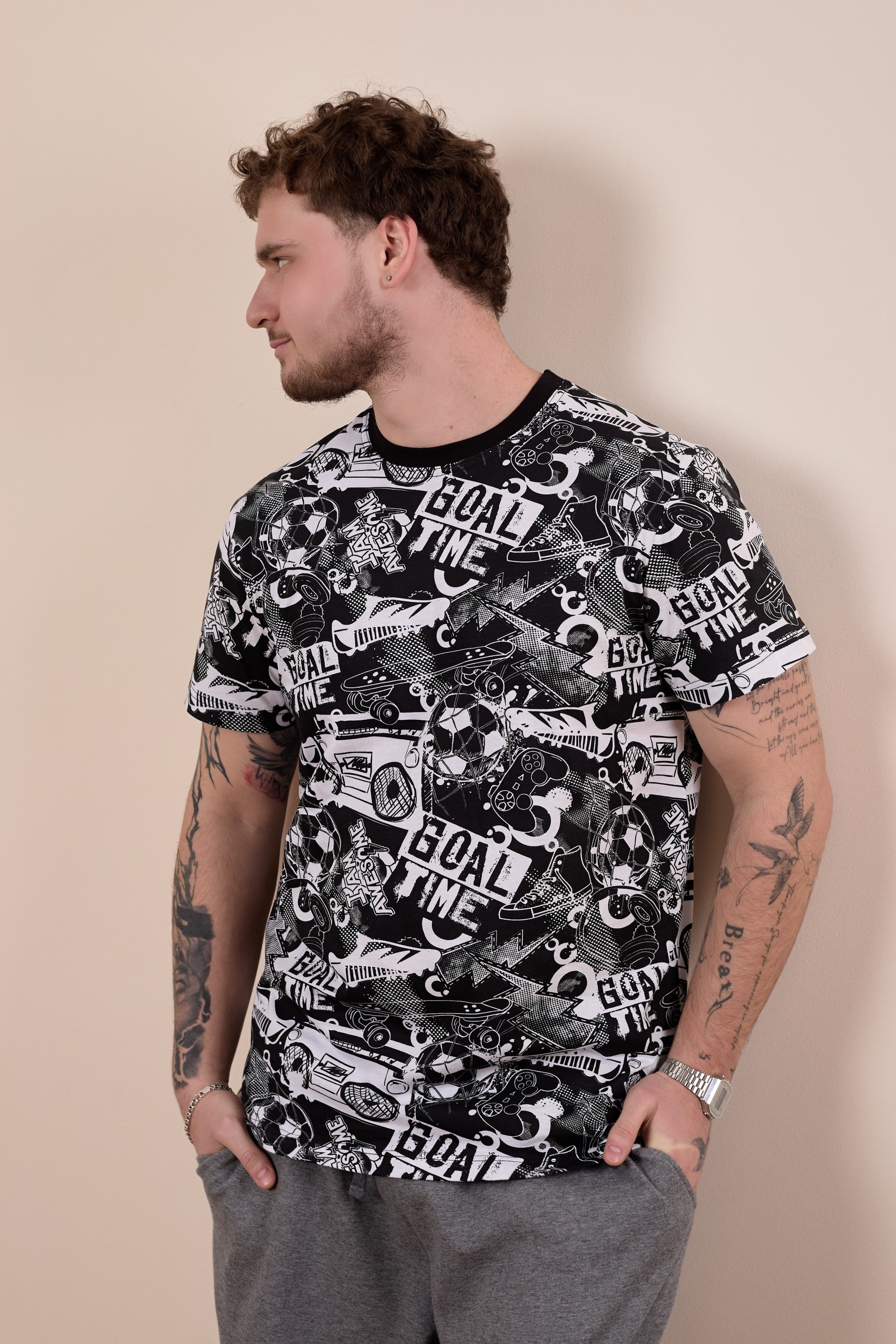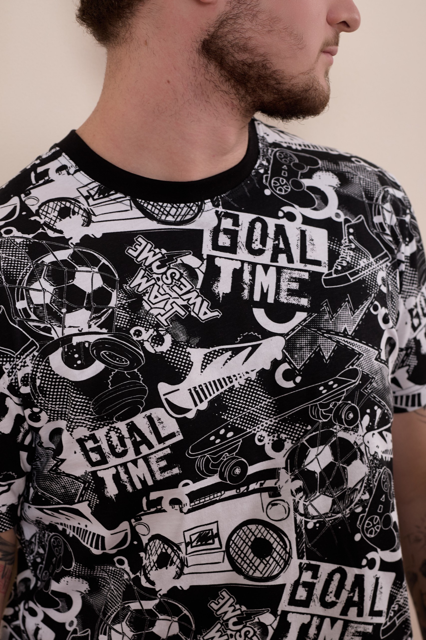 Мужская футболка выполнена из хлопкового полотна с набивным рисунком. Покрой свободный, горловина с круглым вырезом.