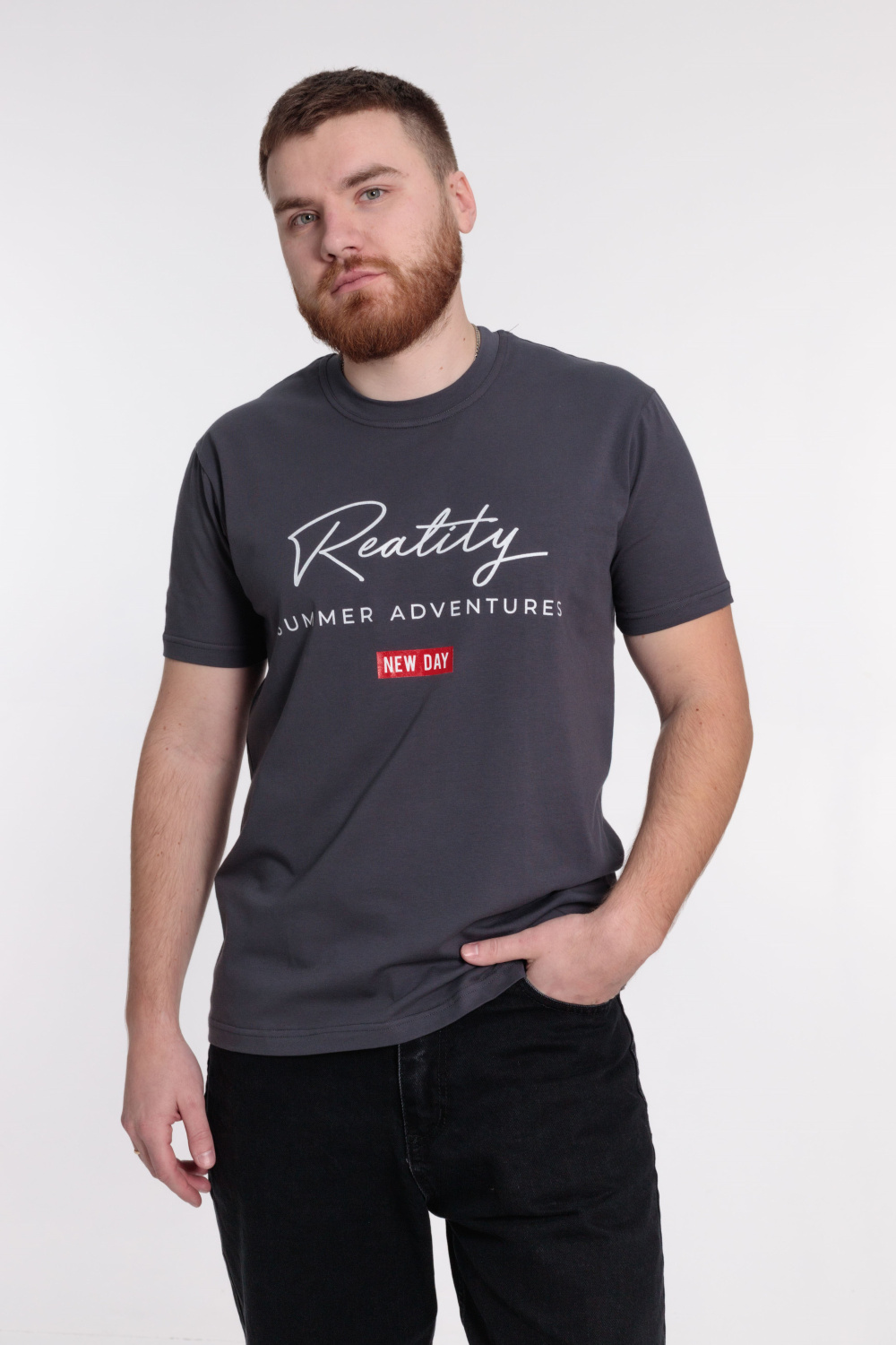 Мужская футболка выполнена из однотонного х/б полотна с лайкрой. Круглый вырез горловины оформлен планкой, рукава короткие. Спереди нанесён принт.