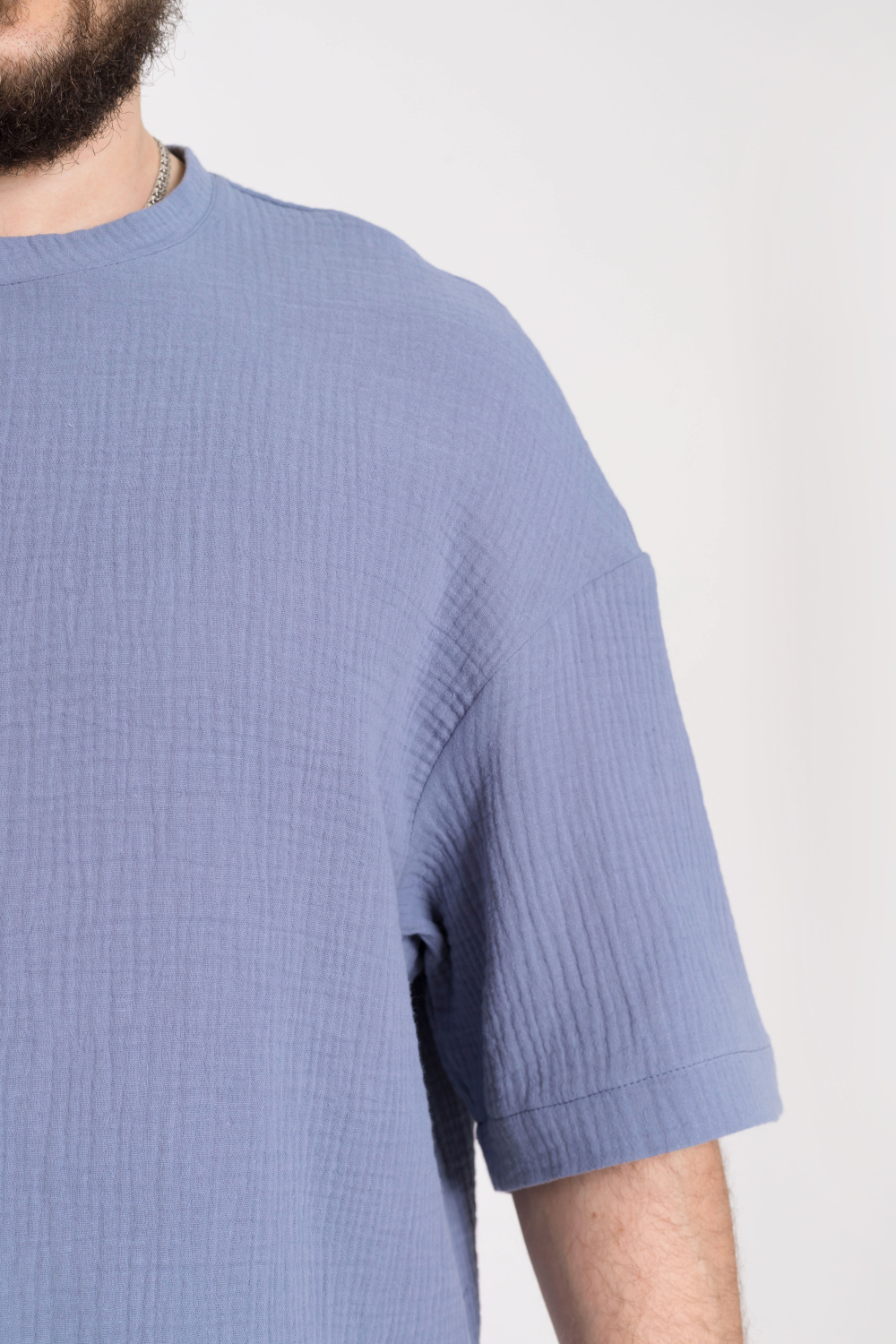 Футболка из однотонного муслина со спущенным рукавом. В боковых швах небольшие разрезы. По горловине притачная планка.
