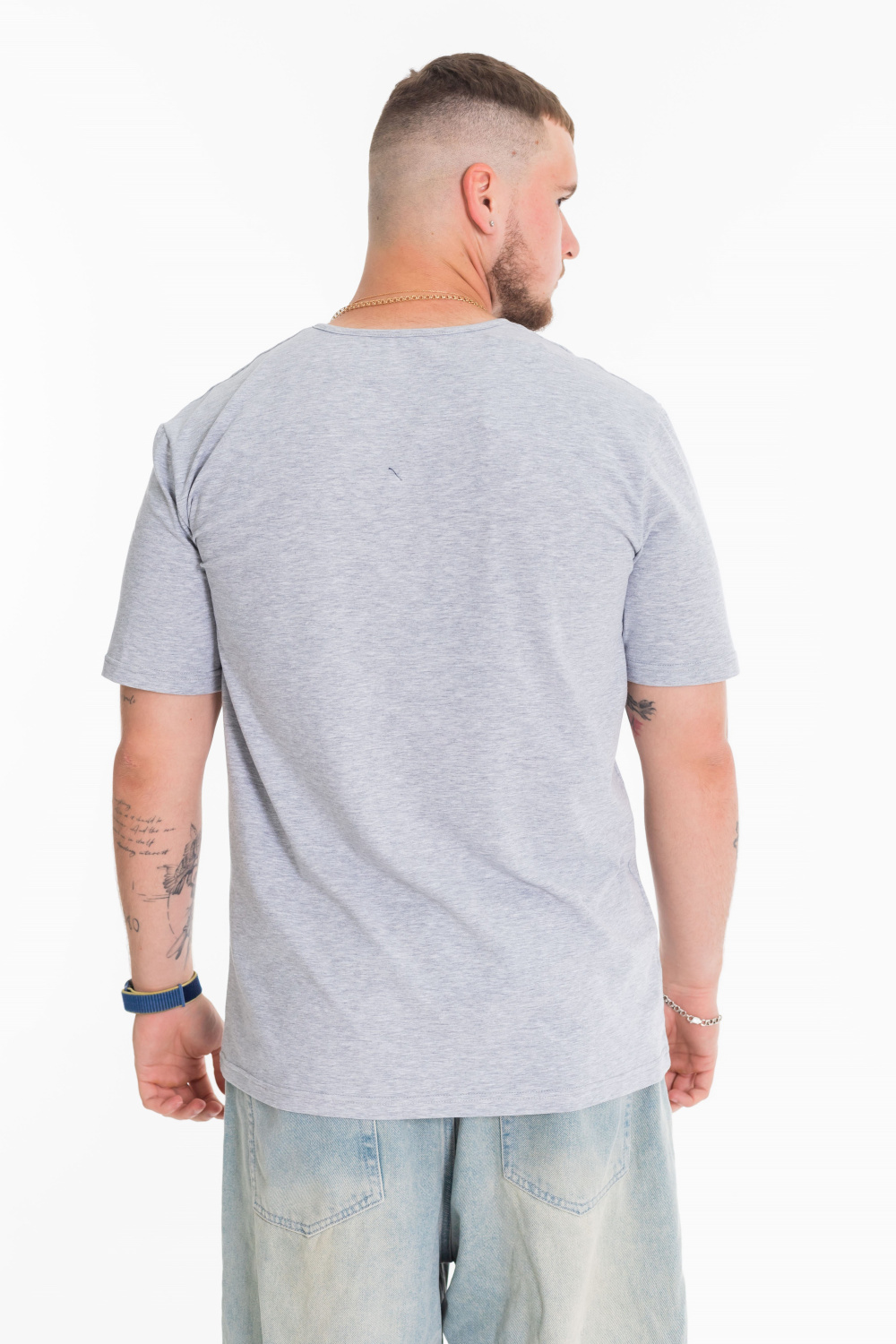 Футболка мужская, выполнена из однотонной хлопковой ткани с добавлением лайкры. Свободного кроя, короткий рукав. Горловина с круглым вырезом, отделанным декоративной планкой с пуговицами.
