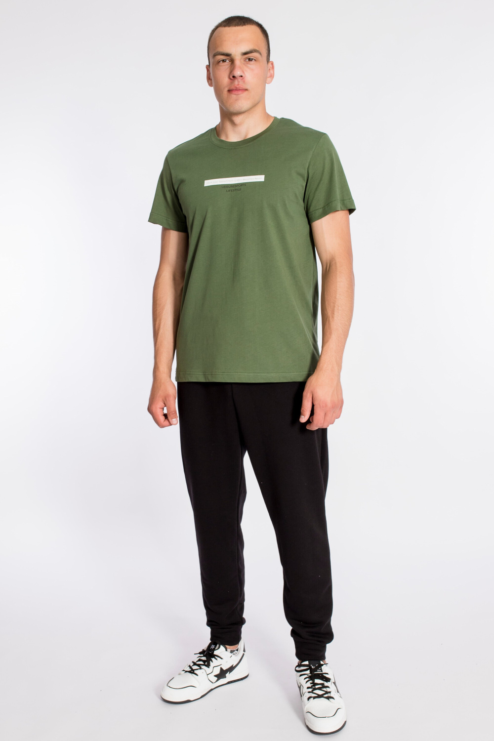 Футболка мужская, выполнена из однотонной хлопковой ткани. Свободного кроя, короткий рукав. Горловина с круглым вырезом, отделанным планкой. Спереди нанесён принт.