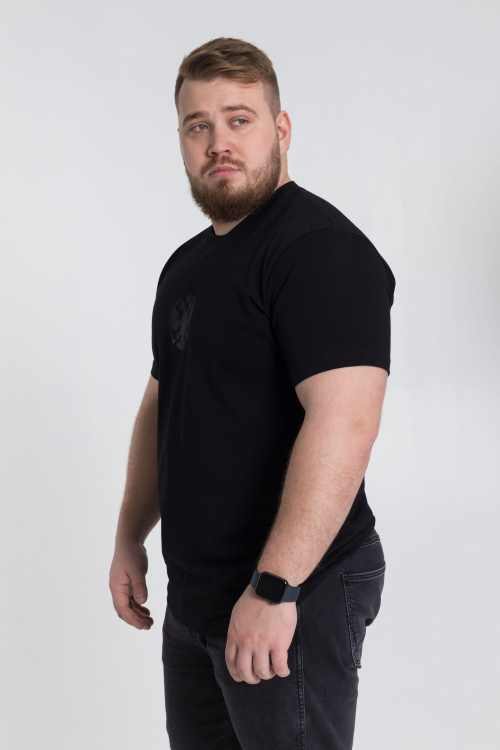 Мужская футболка выполнена из х/б полотна с лайкрой. Круглый вырез горловины, на полочке термопринт