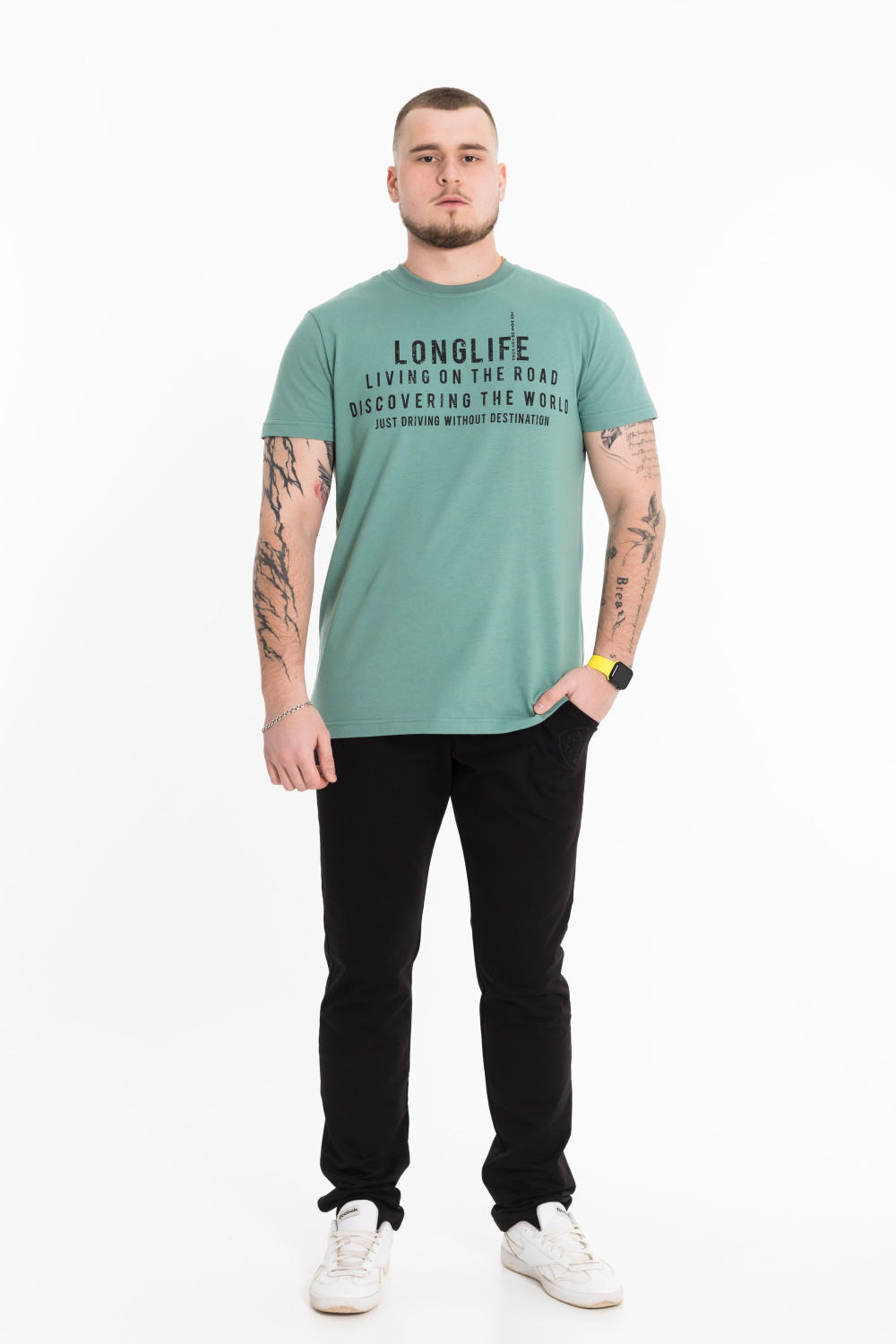 Футболка мужская, выполнена из однотонной хлопковой ткани. Свободного кроя, короткий рукав. Горловина с круглым вырезом, отделанным планкой. Спереди нанесён принт.