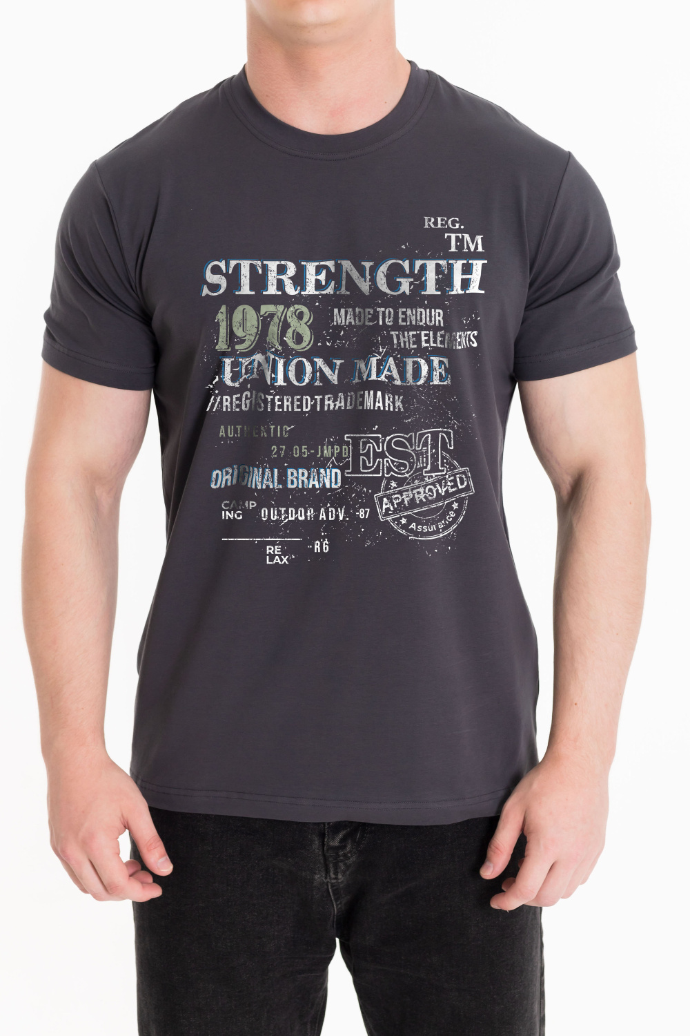 Мужская футболка с принтом выполнена из однотонного х/б полотна с лайкрой. Рукав короткий, втачной, горловина имеет круглый вырез.