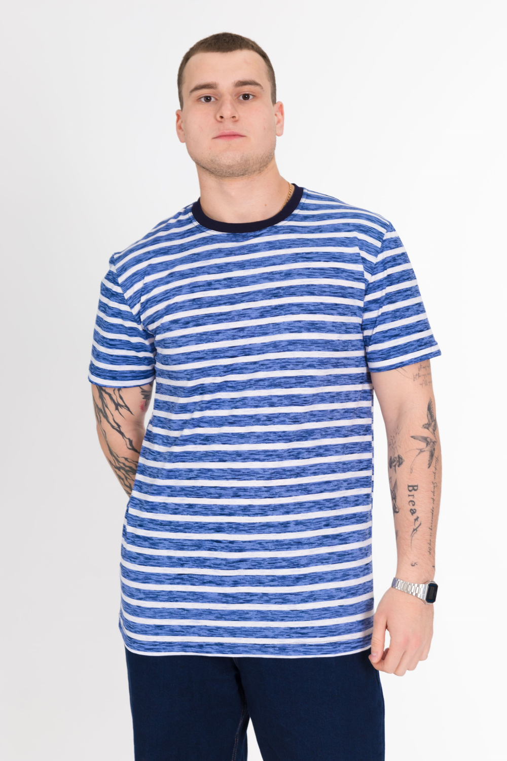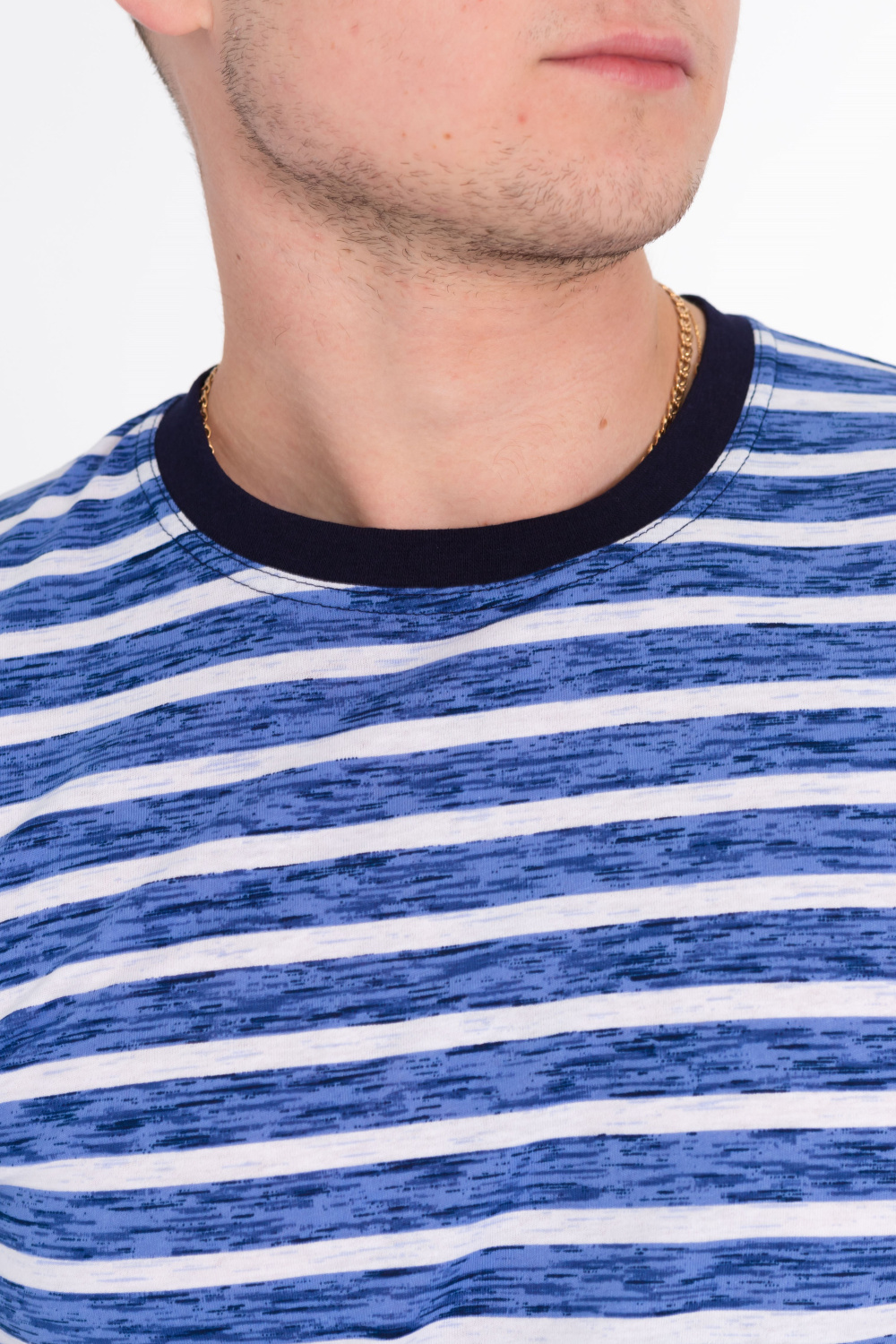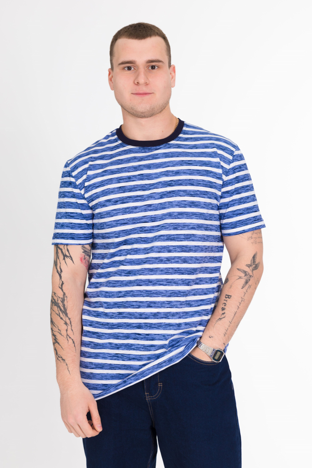 Мужская футболка выполнена из хлопкового полотна. Горловина имеет круглый вырез, рукава короткие.
