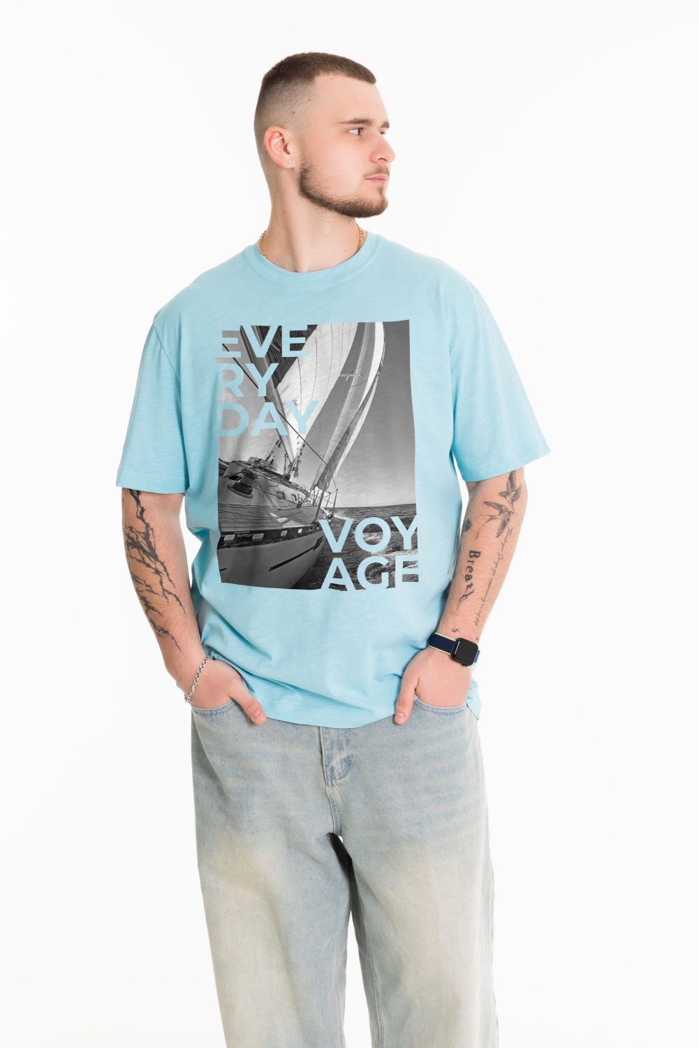 Мужская футболка с принтом спереди изготовлена из хлопкового полотна - кулирка "фламли", что обеспечивает комфорт и хорошую воздухопроницаемость. Футболка имеет короткий рукав и круглый вырез горловины. Изготовленная из натуральной ткани, футболка обеспечит комфорт в течение всего дня.