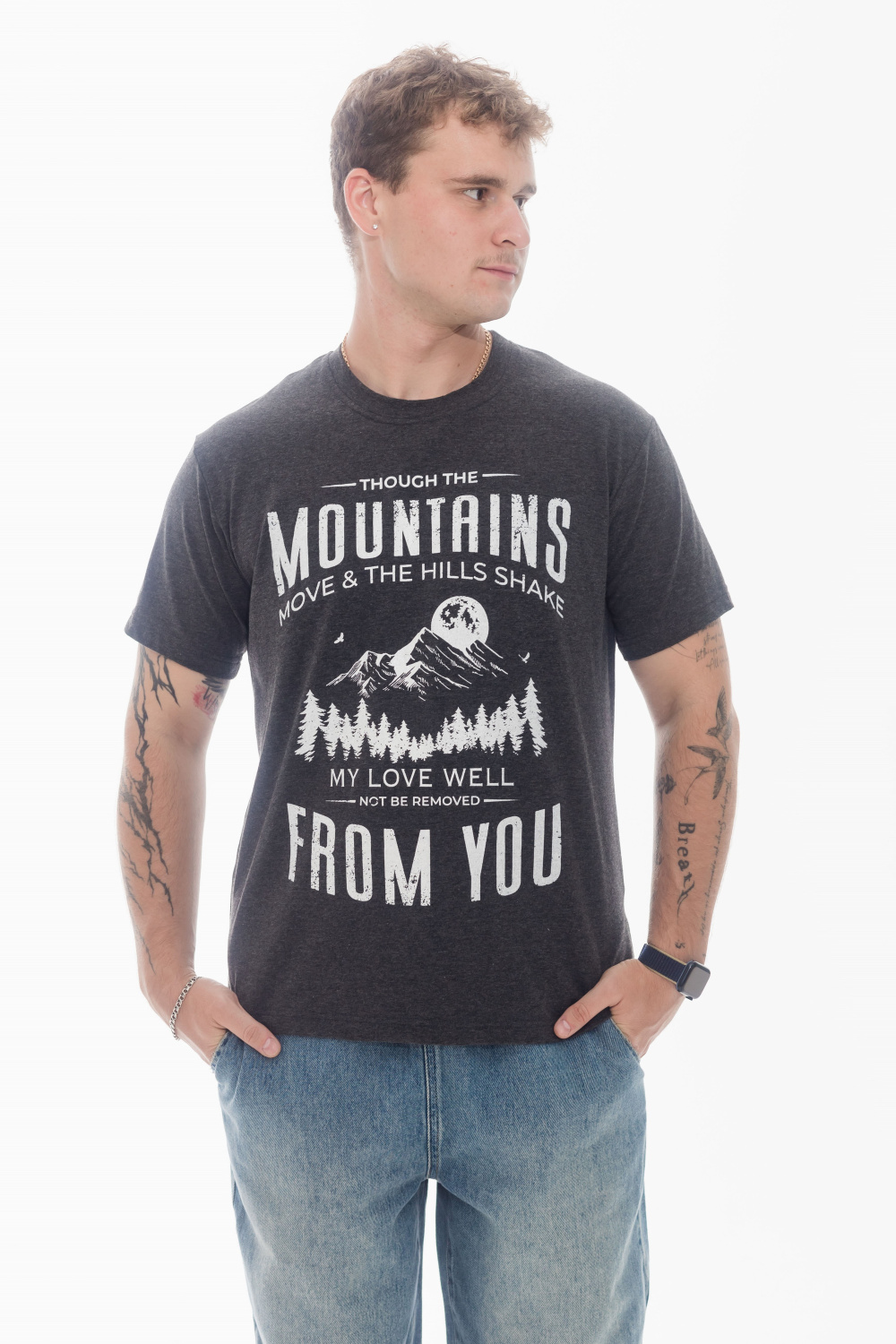 Футболка мужская, выполнена из однотонной хлопковой ткани с добавлением лайкры. Футболка с коротким рукавом и горловиной с круглым вырезом, отделанной планкой. Спереди нанесён принт.