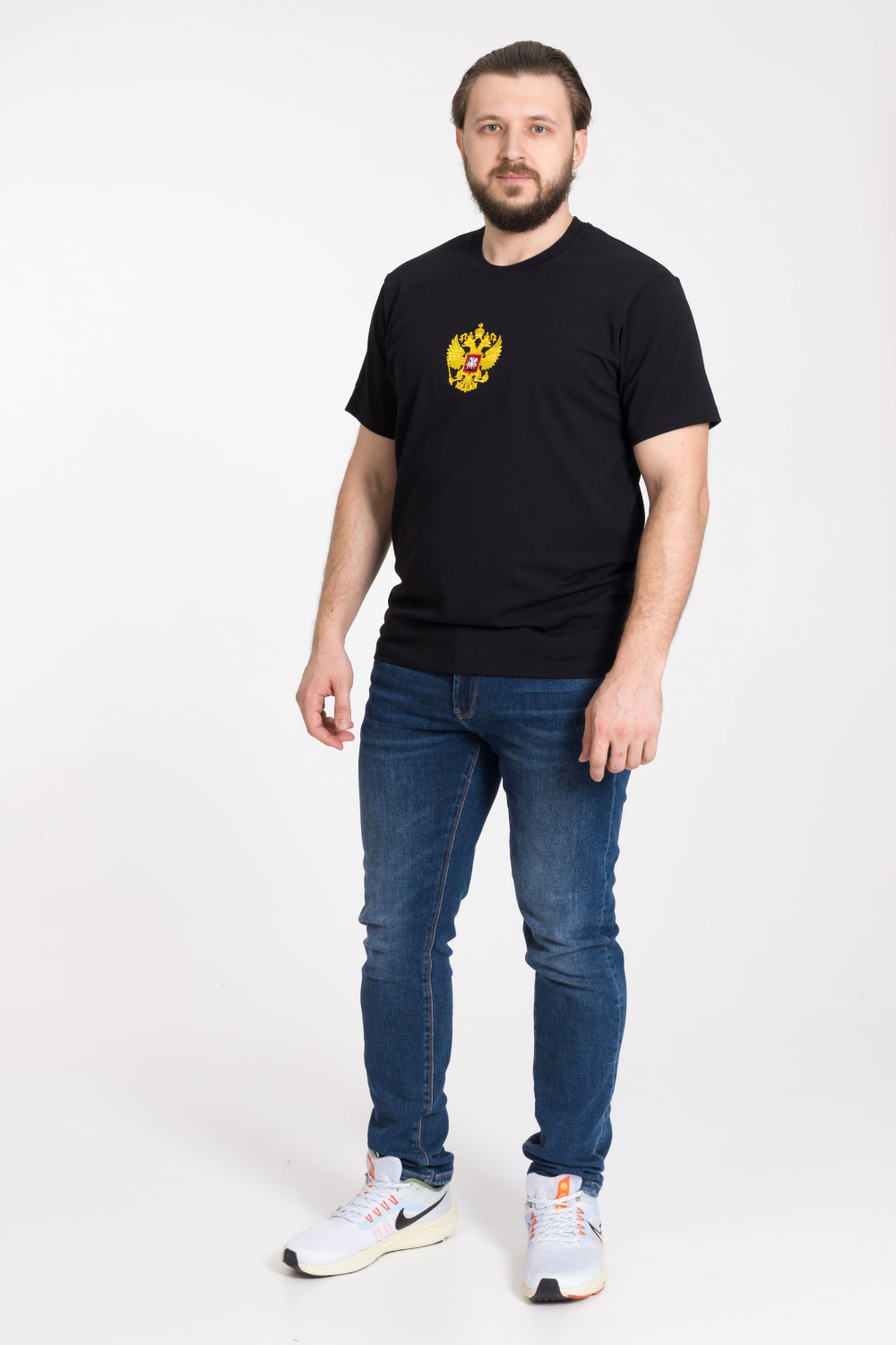 Мужская футболка выполнена из х/б полотна с лайкрой. Круглый вырез горловины, втачной рукав, на полочке вышивка.