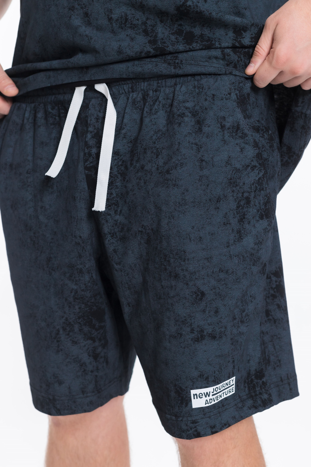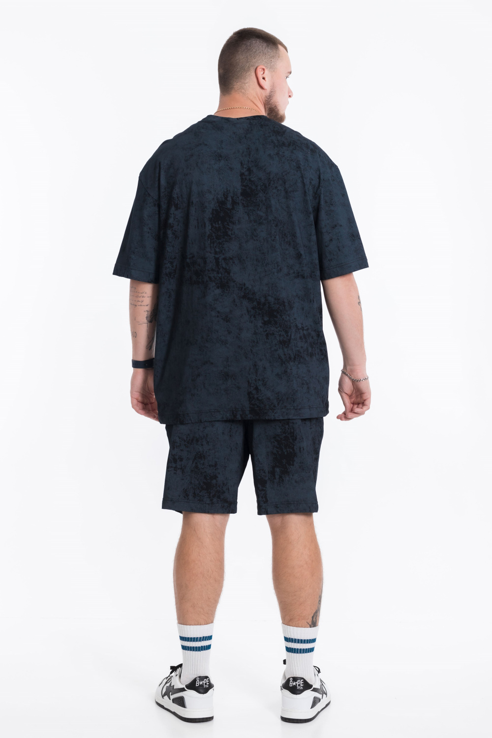 Футболка имеет спущенную линию плеча и короткие рукава, а также интересный принт спереди. Шорты оснащены карманами по бокам и поясом на широкой резинке со шнуром. Кроме того, принт на штанинах шорт соответствует принту на футболке, создавая стильный и гармоничный образ.
