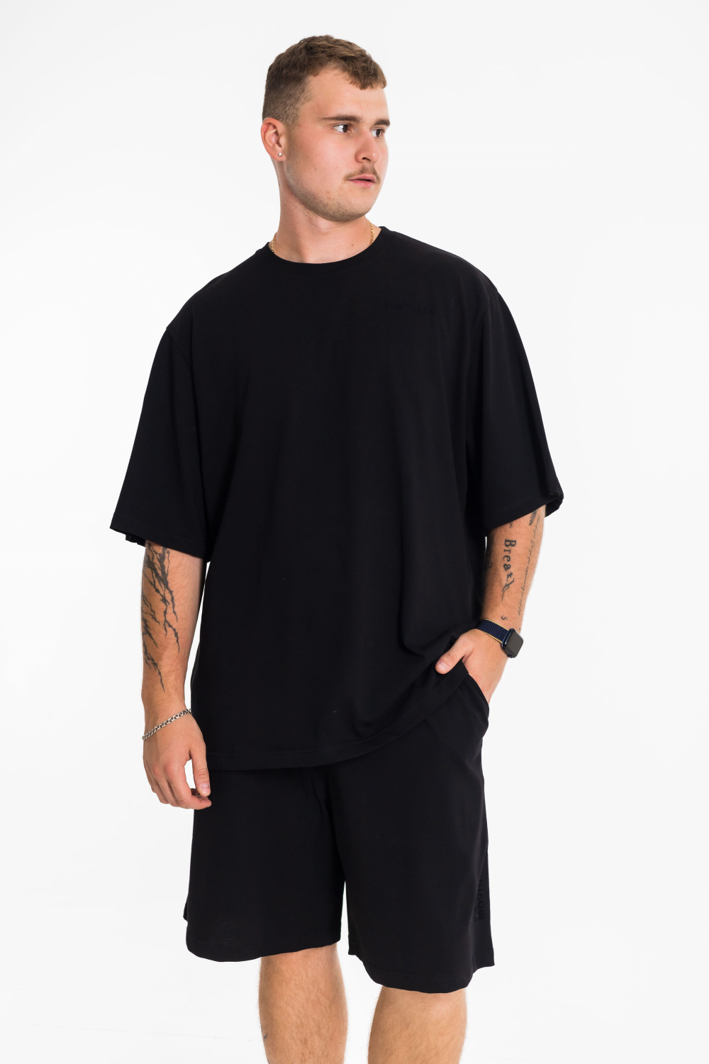 Костюм мужской выполнен из плотной однотонной кулирки. Футболка оверсайз, на груди нанесён термопринт. Шорты с поясом на резине и шнуре, с карманами по бокам. С левой стороны на шортах нанесён термопринт.