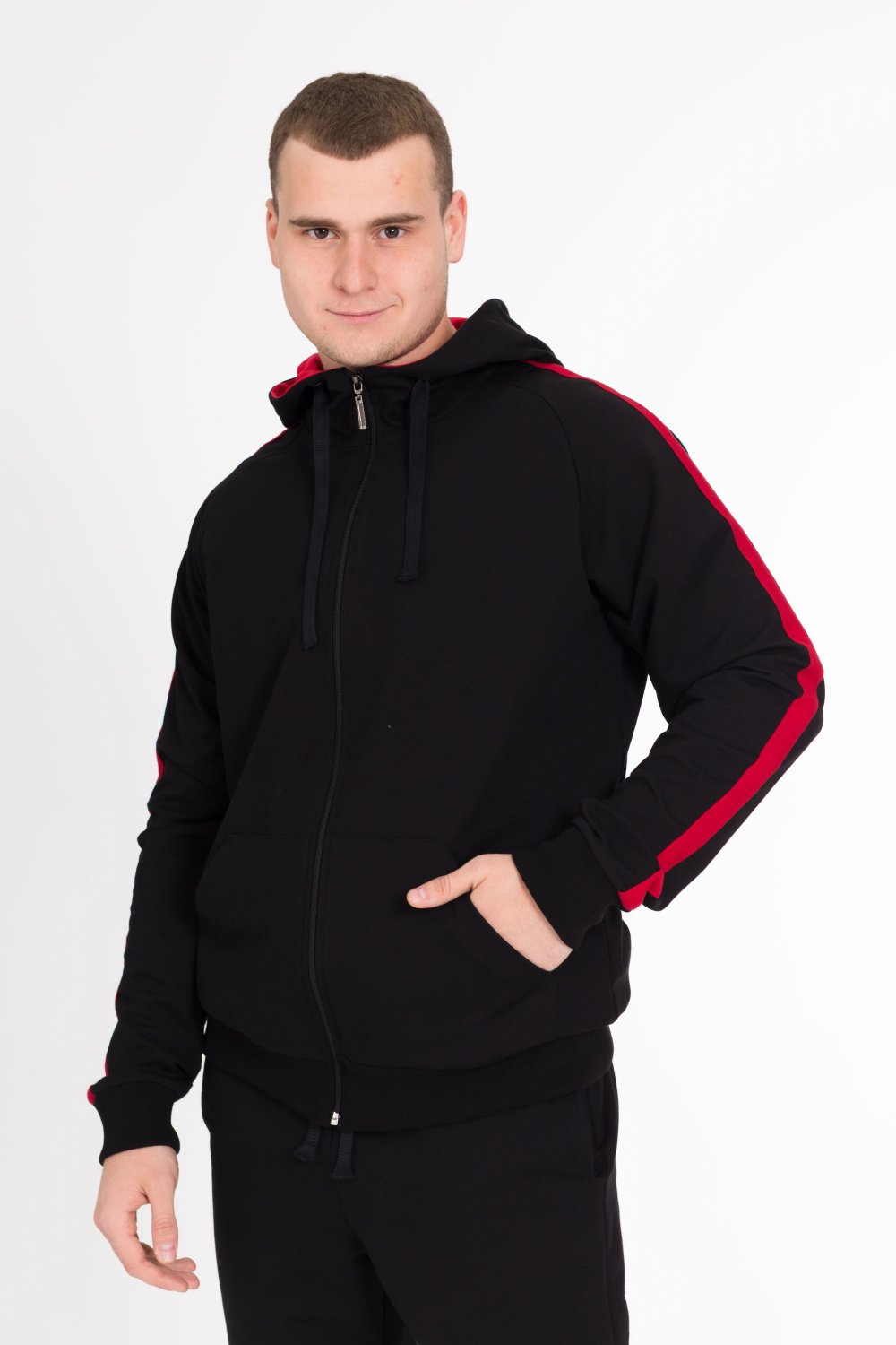 Мужской спортивный костюм из футер петли, куртка с карманами, длинным рукавом, капюшоном, застёжкой на молнию. Брюки с карманами по бокам, пояс на резинке и шнуре, внизу на манжетах. На куртке и штанах вставки из полотна контрастного цвета.