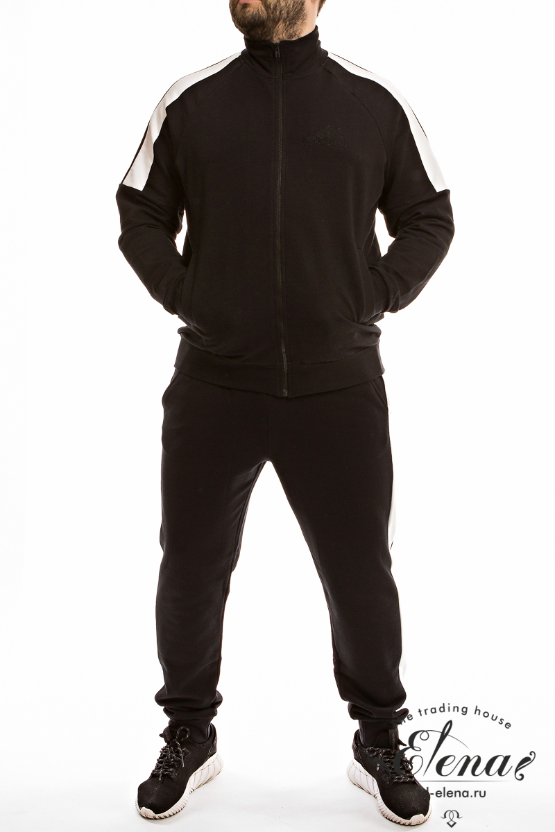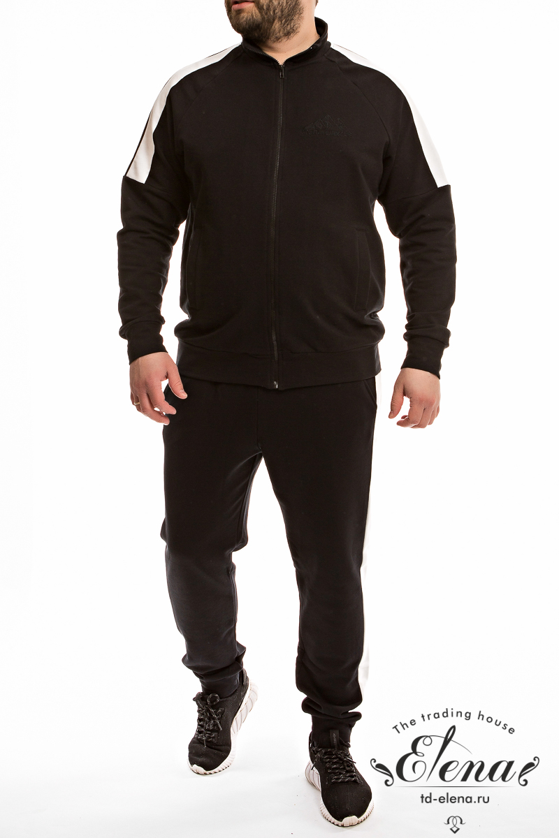 Костюм из однотонной футер петли трёхнитки воздушка с отделочными полосами на брюках и верхних частях рукавов. Брюки с притачным поясом и манжетами внизу. В поясе через люверсы проложен шнур. Толстовка с воротником, рукавами реглан, с притачным поясом и манжетами. Спереди застёжка на молнию, с левой стороны вышивка. Толстовка и брюки с карманами по бокам.