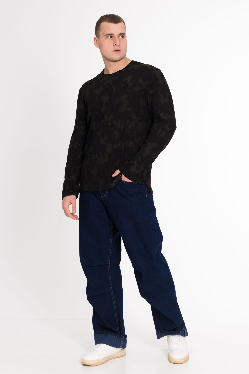 Футболка с длинным рукавом выполнена из интерлока камуфляжной расцветки.
