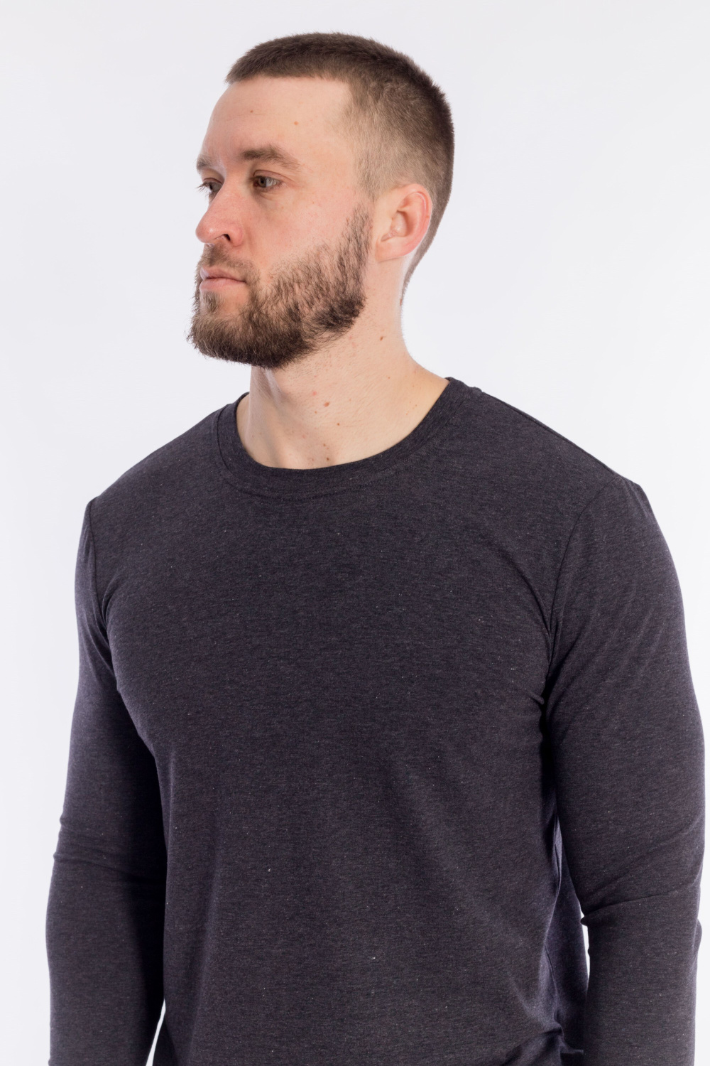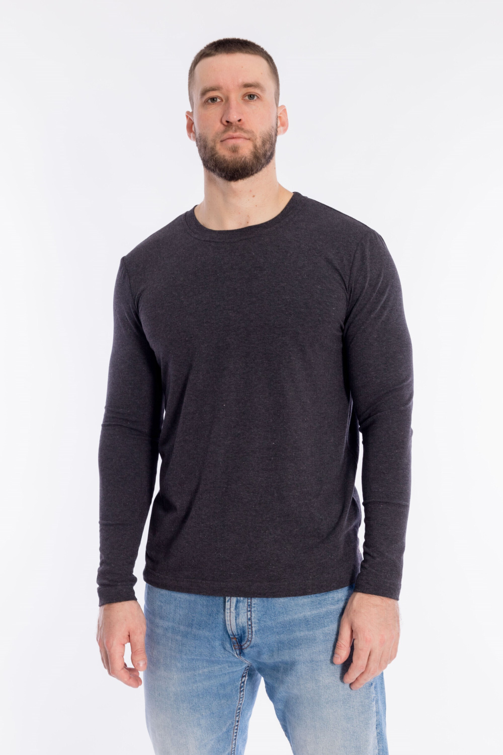 Лонгслив для мужчин выполнен из кулирки с лайкрой. Модель с длинными рукавами и круглым вырезом горловины, оформленным планкой.