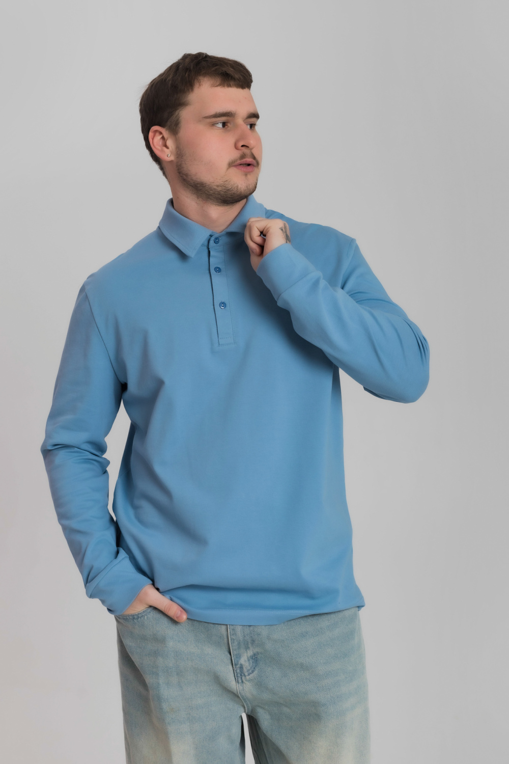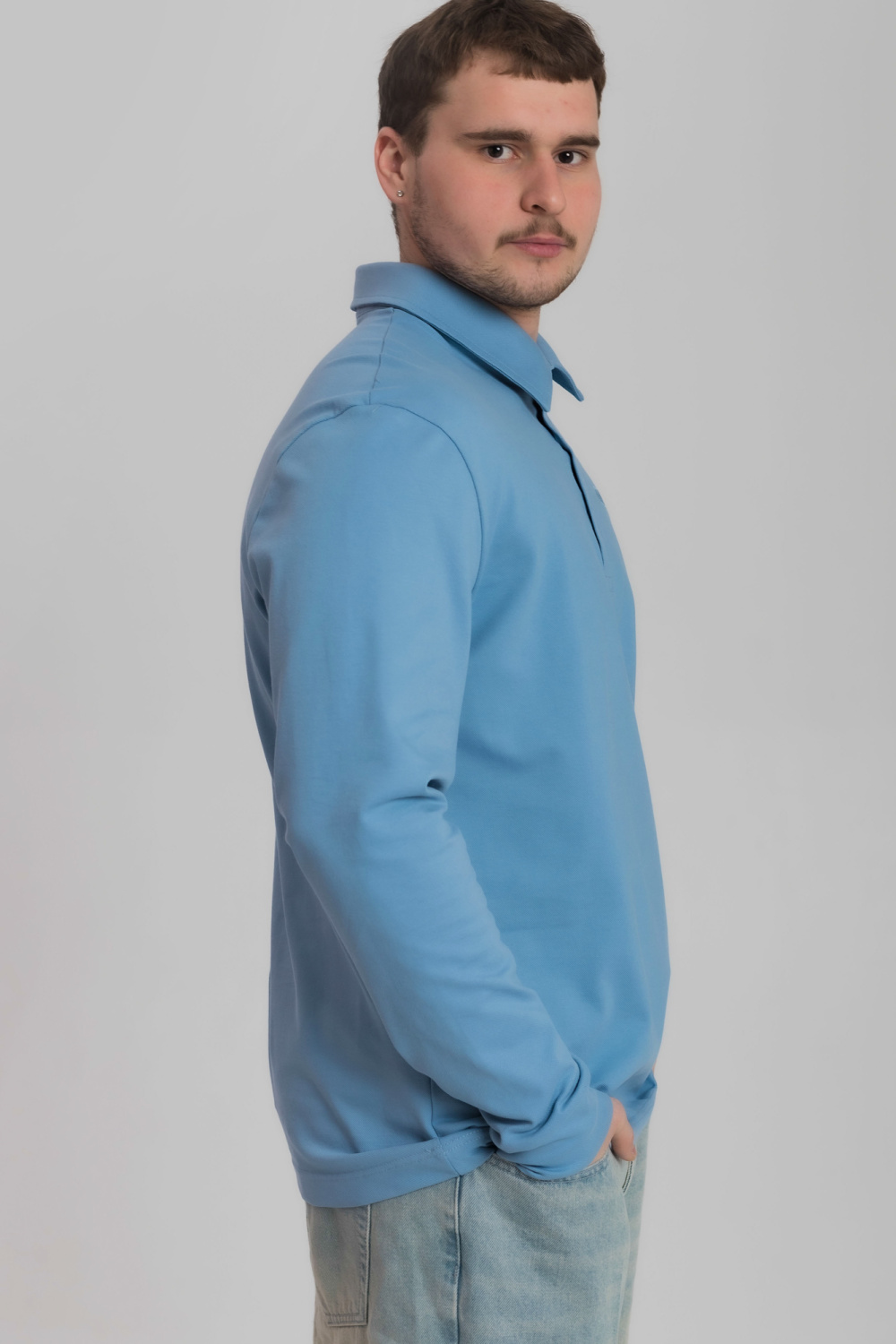 Лонгслив-поло из однотонного пике с втачным рукавом на притачной манжете. Воротник на отрезной стойке. Застежка на полочке на пуговицы. С левой стороны полочки вышивка фирменного логотипа в цвет поло.