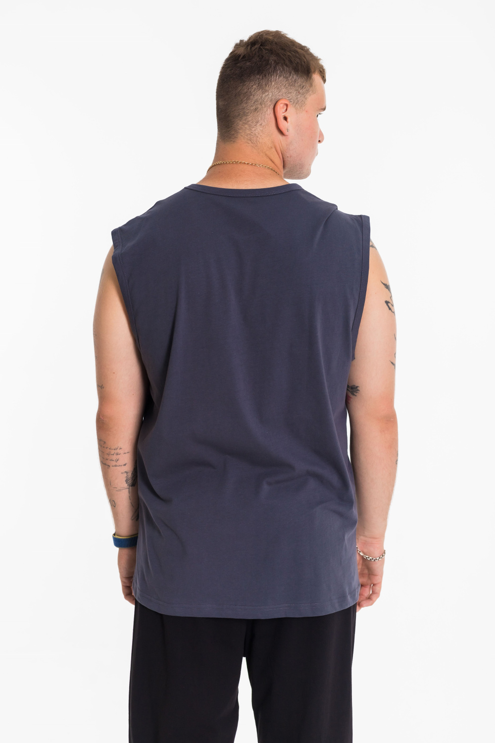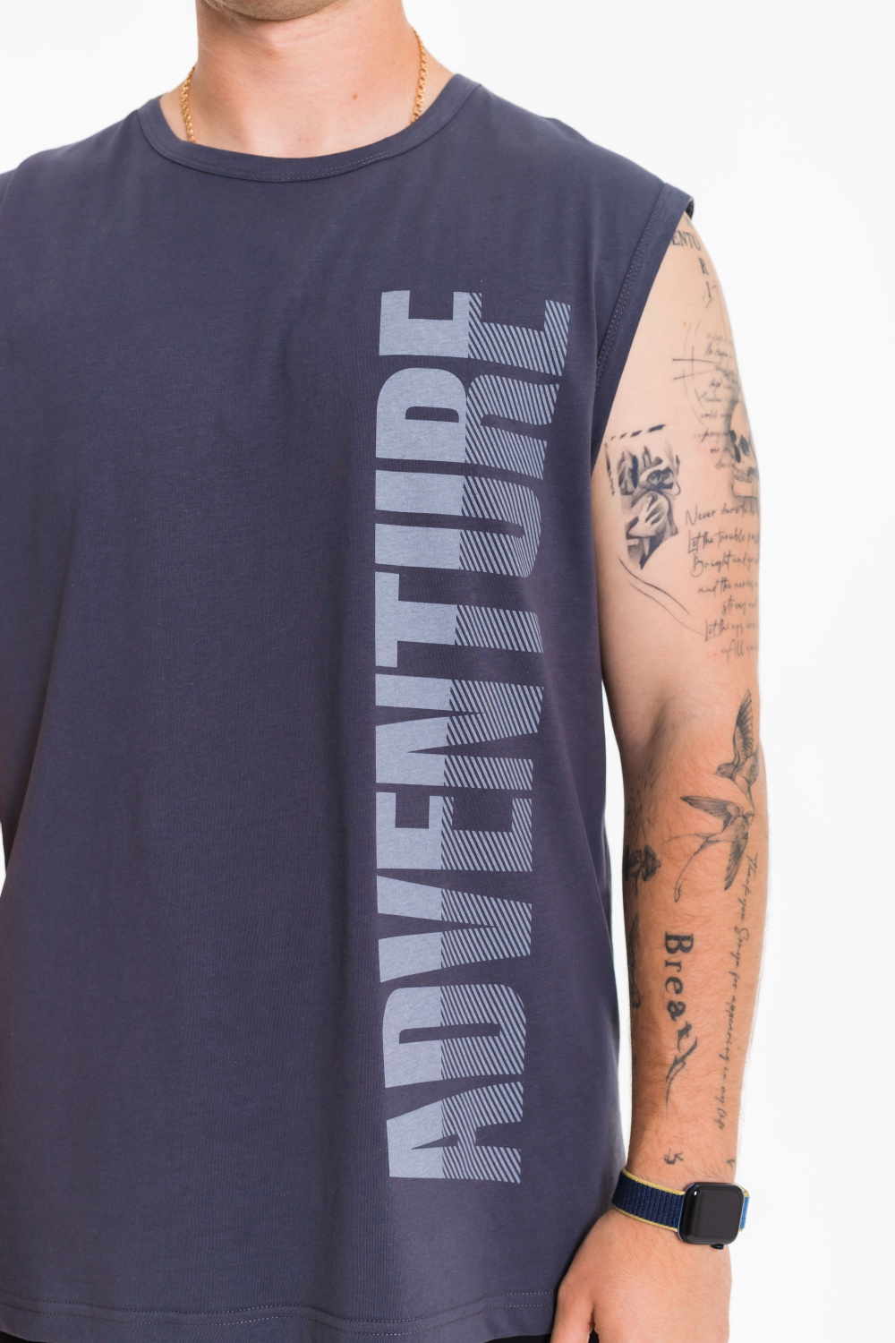 Майка с широким плечом выполнена из однотонной кулирки, 100% хлопок. Круглая горловина и проймы обработаны широкой бейкой. Спереди расположен принт.