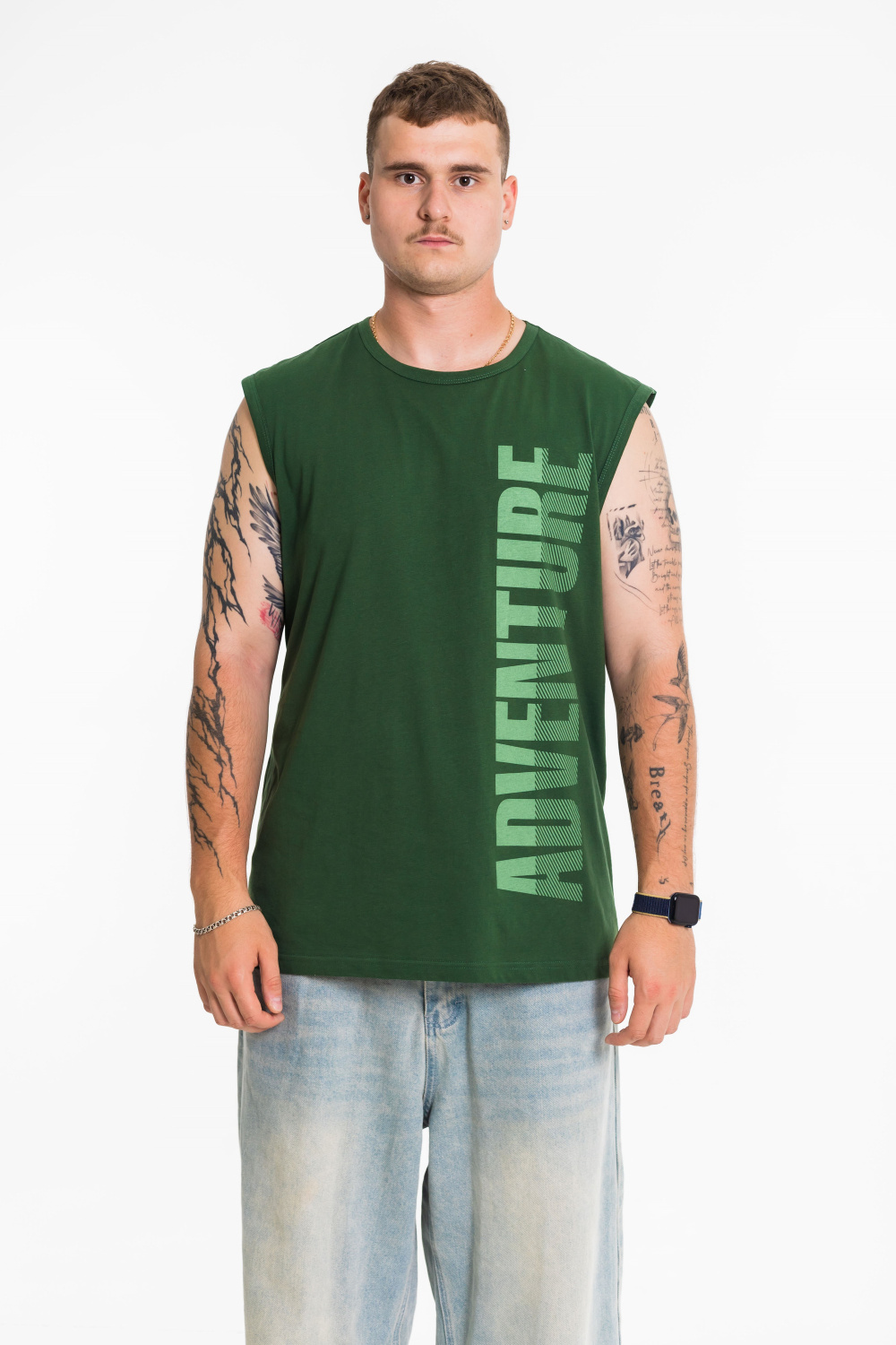 Майка с широким плечом выполнена из однотонной кулирки, 100% хлопок. Круглая горловина и проймы обработаны широкой бейкой. Спереди расположен принт.