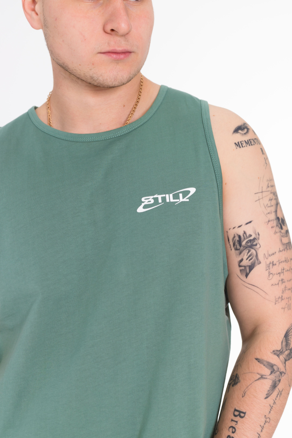 Майка выполнена из однотонной кулирки. Майка с углубленной проймой, спереди нанесён принт.