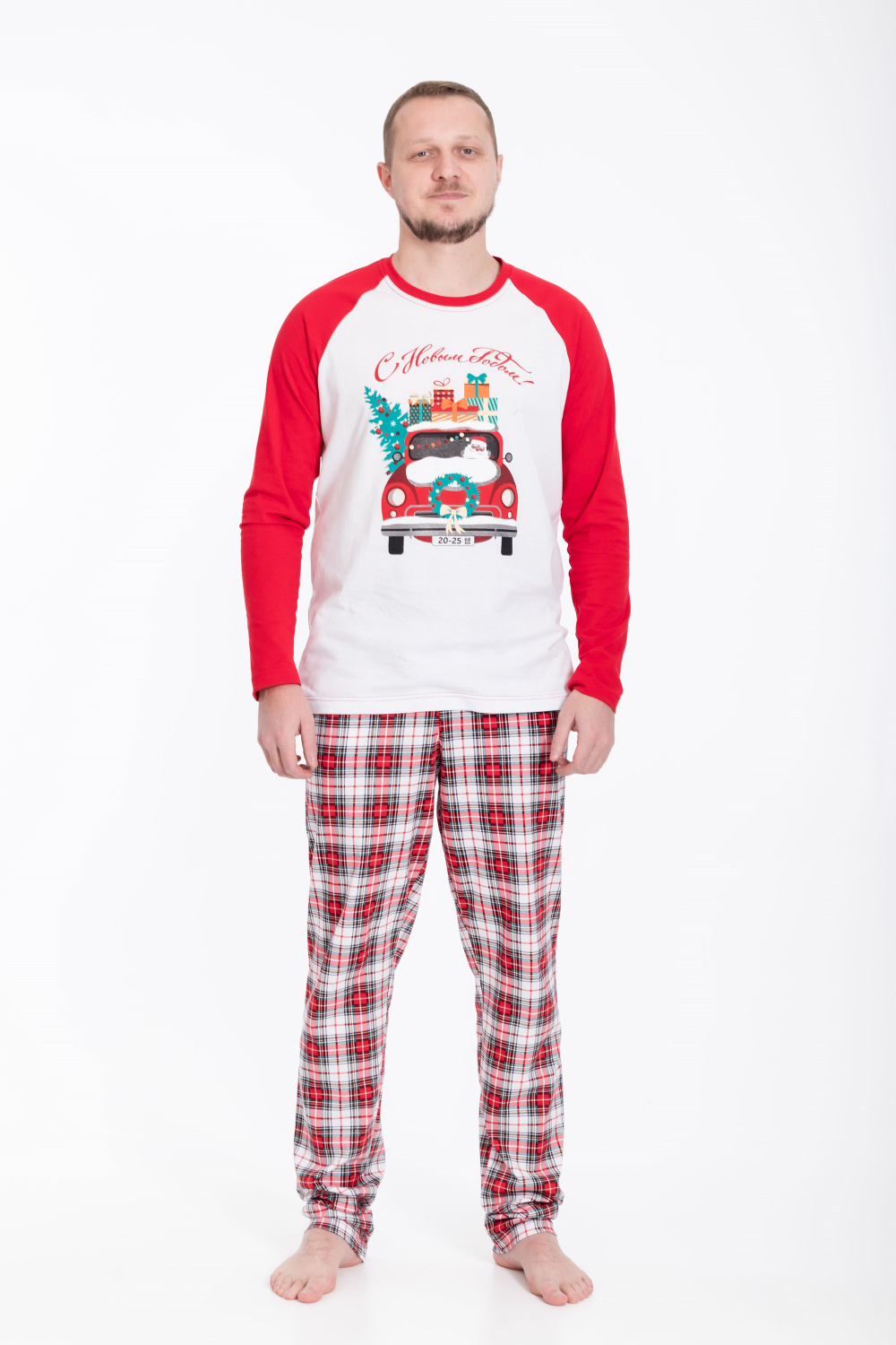 Мужская пижама новогодняя - лонгслив и брюки, изготовлена из мягкого и приятного к телу хлопкового полотна. Лонгслив прямого кроя, рукава реглан, перед и спинка белого цвета, спереди нанесён принт. Круглый вырез горловины отделан бейкой красного цвета. Брюки прямого кроя из кулирки с набивным рисунком в клетку, пояс на резинке. Изготовленная из натуральной ткани, пижама обеспечит комфорт в течение всего дня.