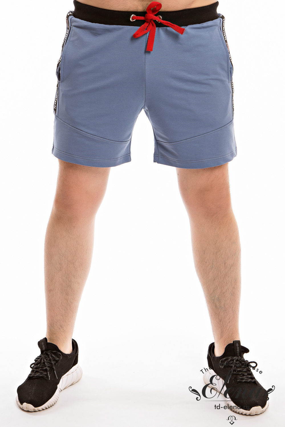 Шорты из футер петли с лайкрой, по бокам два кармана. Параллельно боковому шву, рядом с карманами настрочена отделочная резинка. Сзади расположен накладной карман. Пояс на резинке и шнуре.