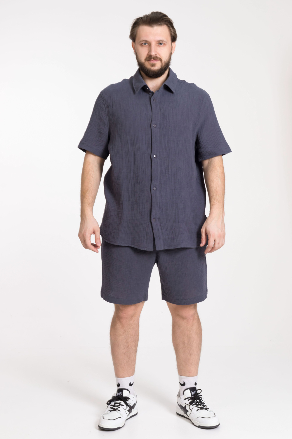 Шорты мужские из однотонного муслина. Пояс на резинке, боковые карманы.